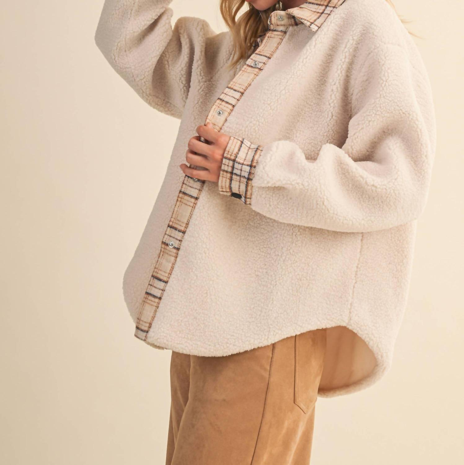 A jacket so versatile you can literally wear it with anything. Introducing the Austin Plaid Contrast Sherpa Jacket by Klesis, a stylish addition to your winter wardrobe. This cream jacket features a cozy oversized fit with a trendy textured pattern and long sleeves, perfect for a streetwear-inspired look. Made from soft polyester, it boasts a button closure, charming collar, and a scoop hem for added style. Care instructions include machine wash and lay flat to dry, ensuring easy maintenance for your travels or Valentine's Day outings.