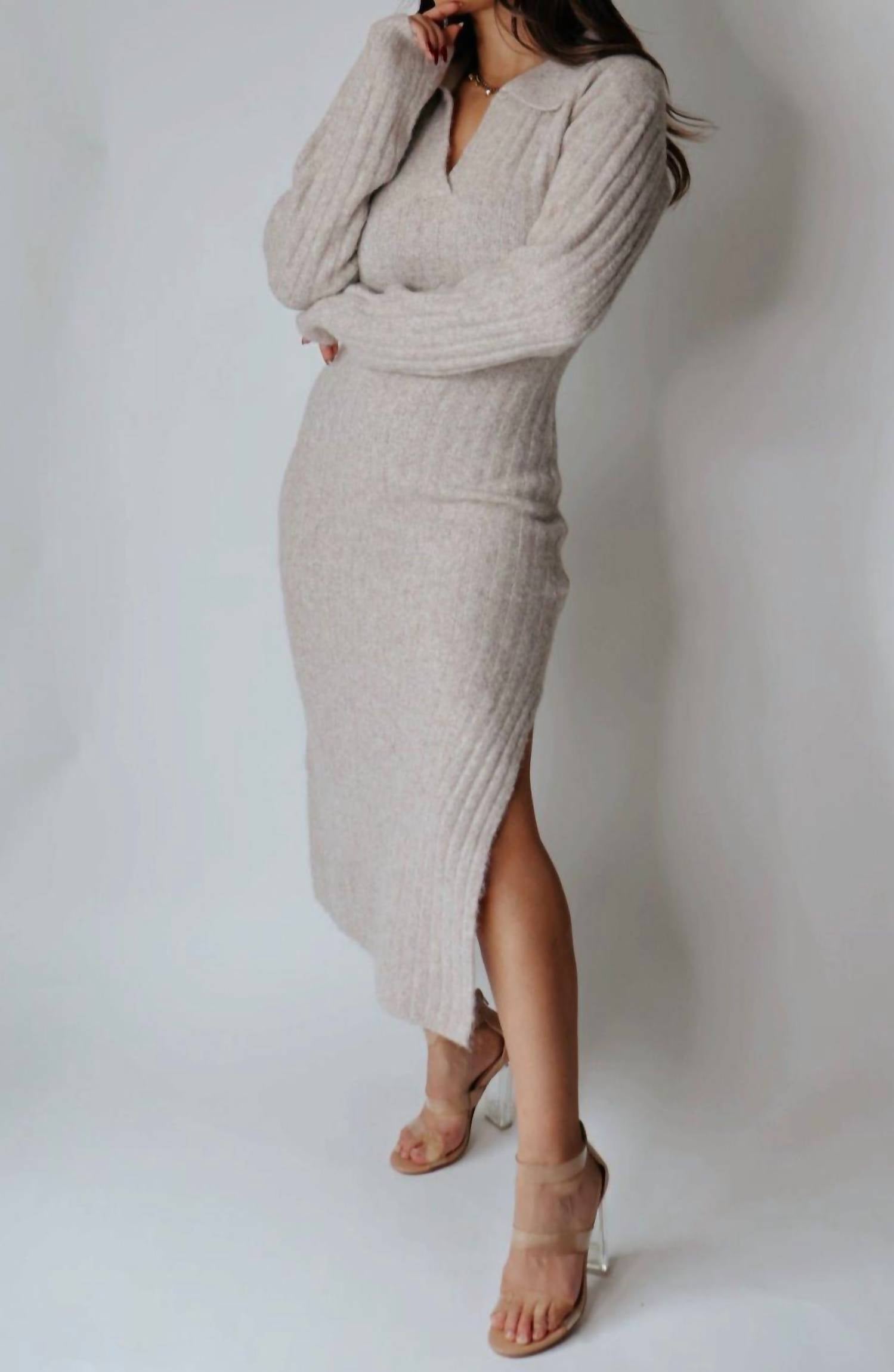 A midi dress so versatile, your options for wearing it are endless. Wrap yourself in the Klesis Cozy Midi Sweater Dress, perfect for winter dinner parties with its chic, minimalist allure. This textured beige dress features long sleeves and a sophisticated collar, complemented by the playful side slit that adds a touch of elegance. The fuzzy sweater fabric ensures both comfort and style, while the pull-on closure makes it easy to wear. At 47 inches in length and true to size, it's designed for ease with machine wash and tumble dry care instructions.