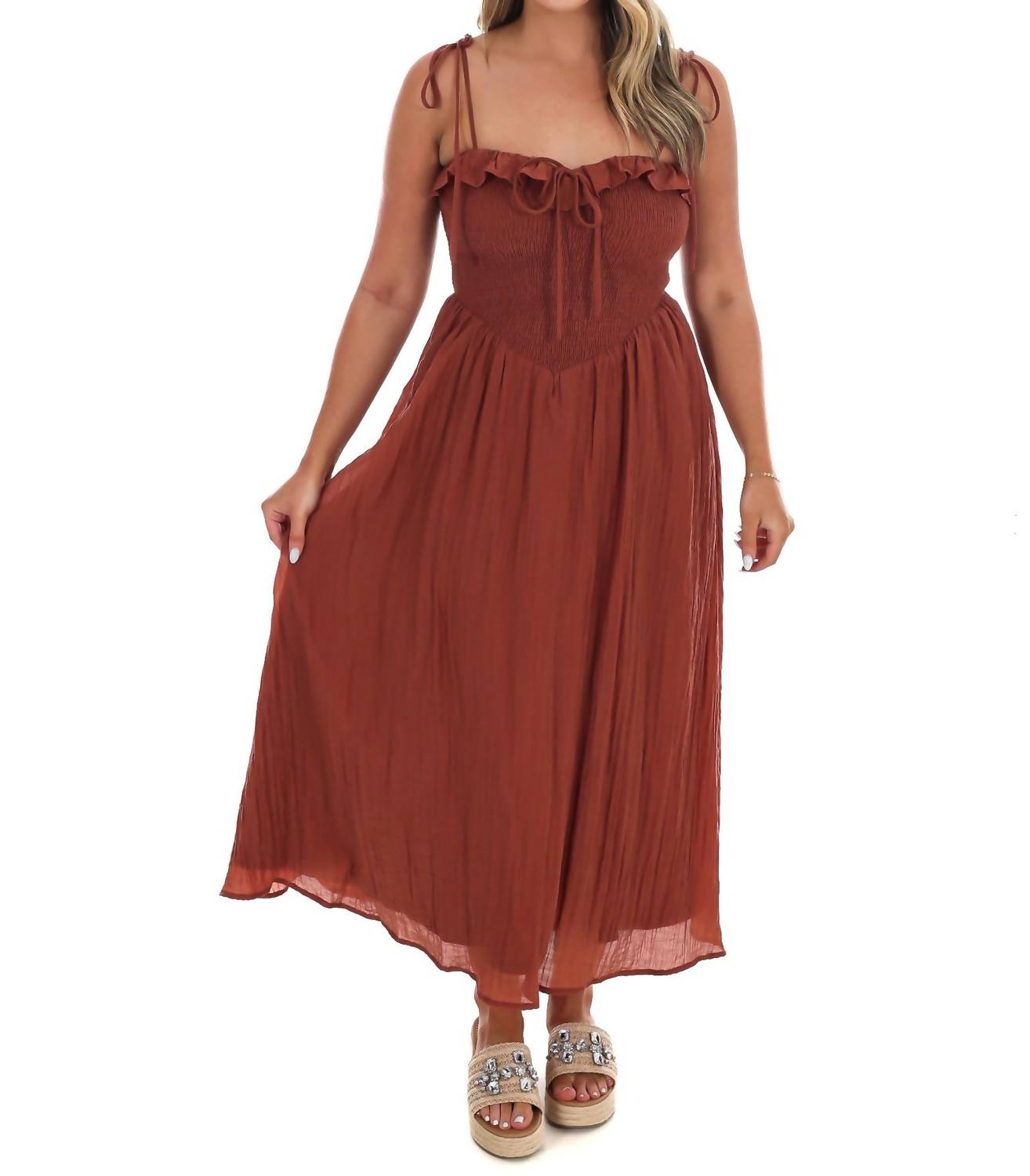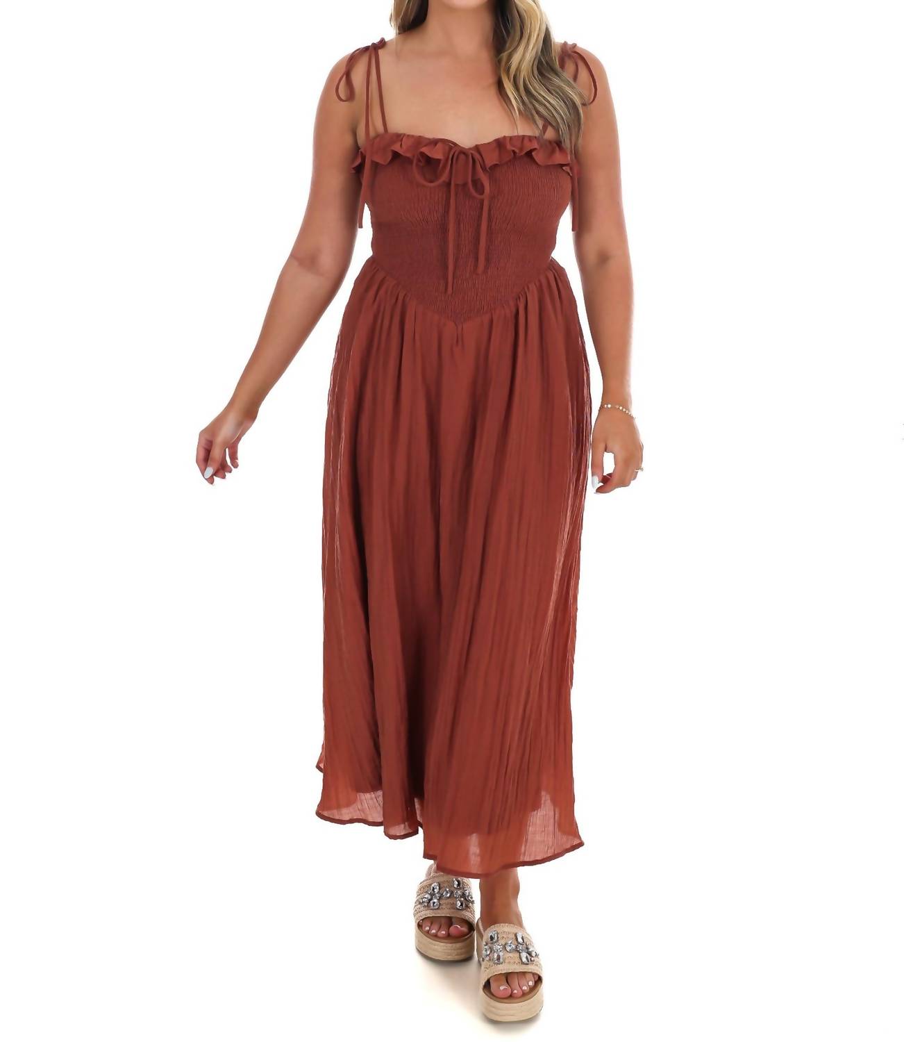 The perfect length dress does exist. Introducing the Inspired By You Midi Dress by Klesis, a sophisticated piece in a stunning rust color, perfect for Valentine's Day celebrations. Featuring spaghetti straps and a flattering A-line silhouette, this dress exudes quiet luxury with its elegant sweetheart neckline. The dress is crafted for evenings, offering ease with a practical tie closure. Machine washable for convenience, this solid-patterned midi promises both style and grace for any spring event.
