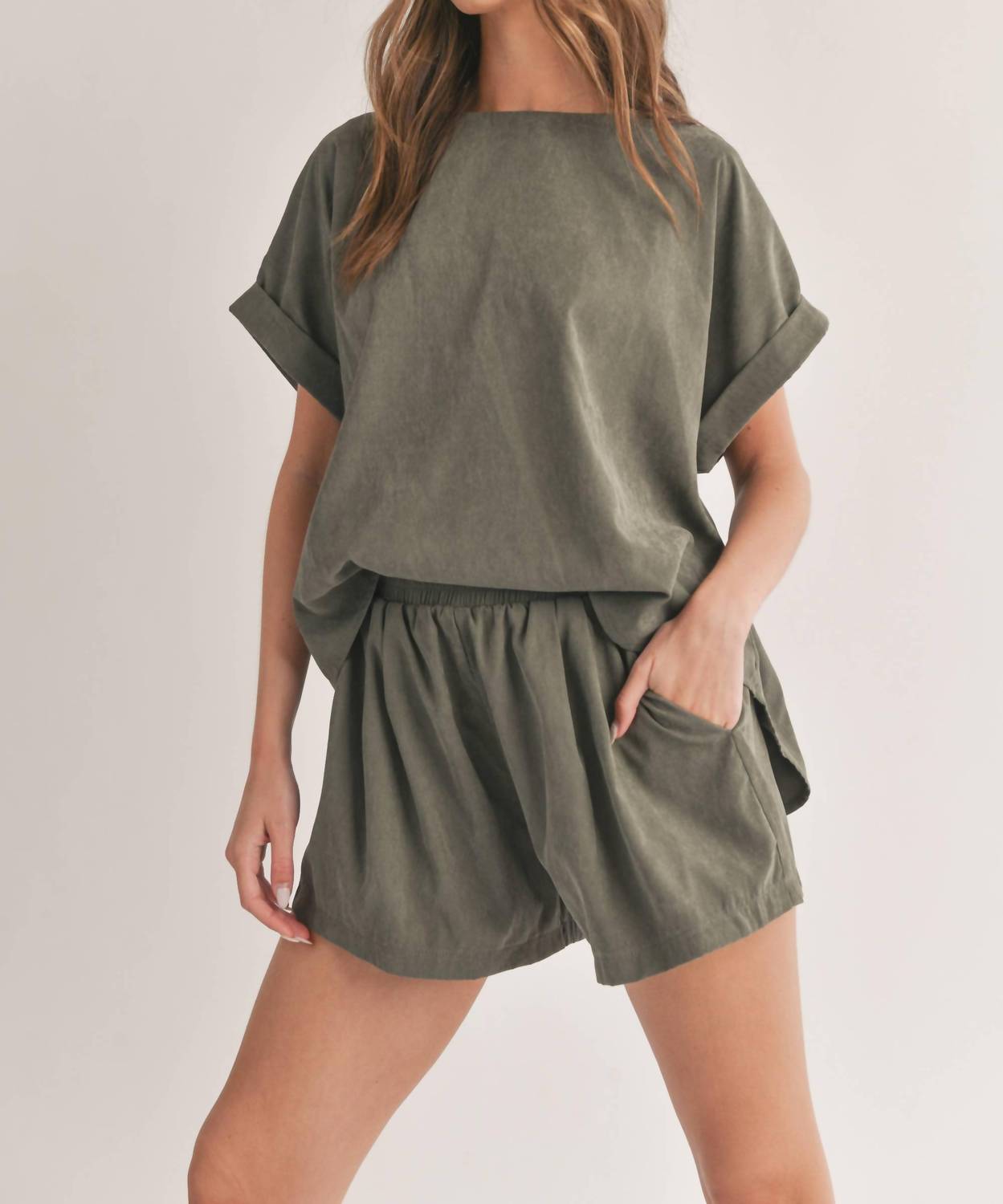 Throw it on and go! Introducing the Laurel Relaxed Top & Shorts Set by Klesis, an olive-toned ensemble perfect for effortless summer style. The set features rolled sleeves and a boxy fit top paired with relaxed fit, wide-leg pull-on shorts that boast an elastic waist and handy pockets. Made from silky soft 100% polyester, its solid pattern complements a mid-rise waist, offering chic comfort. Care instructions include machine wash and line dry, making it a fuss-free addition to your vacation wardrobe.