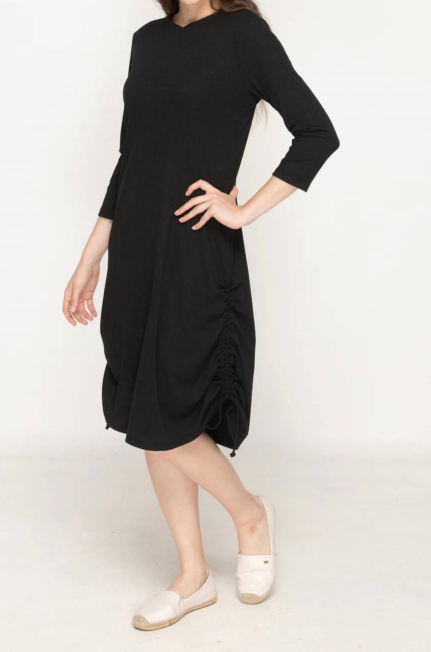 A midi dress so versatile, your options for wearing it are endless. Introducing the Rib Ruched Dress by KMW, a perfect blend of comfort and style in a classic black hue. This dress features three-quarter sleeves and a shift silhouette for a minimalist look, complete with a crewneck and solid pattern. Made to be versatile, it boasts adjustable drawstrings to personalize the length, making it ideal for layering as a transitional piece for any season. Enjoy the ease of a pull-on closure and the convenience of machine wash care, making it a go-to for casual dinners or festive gatherings.