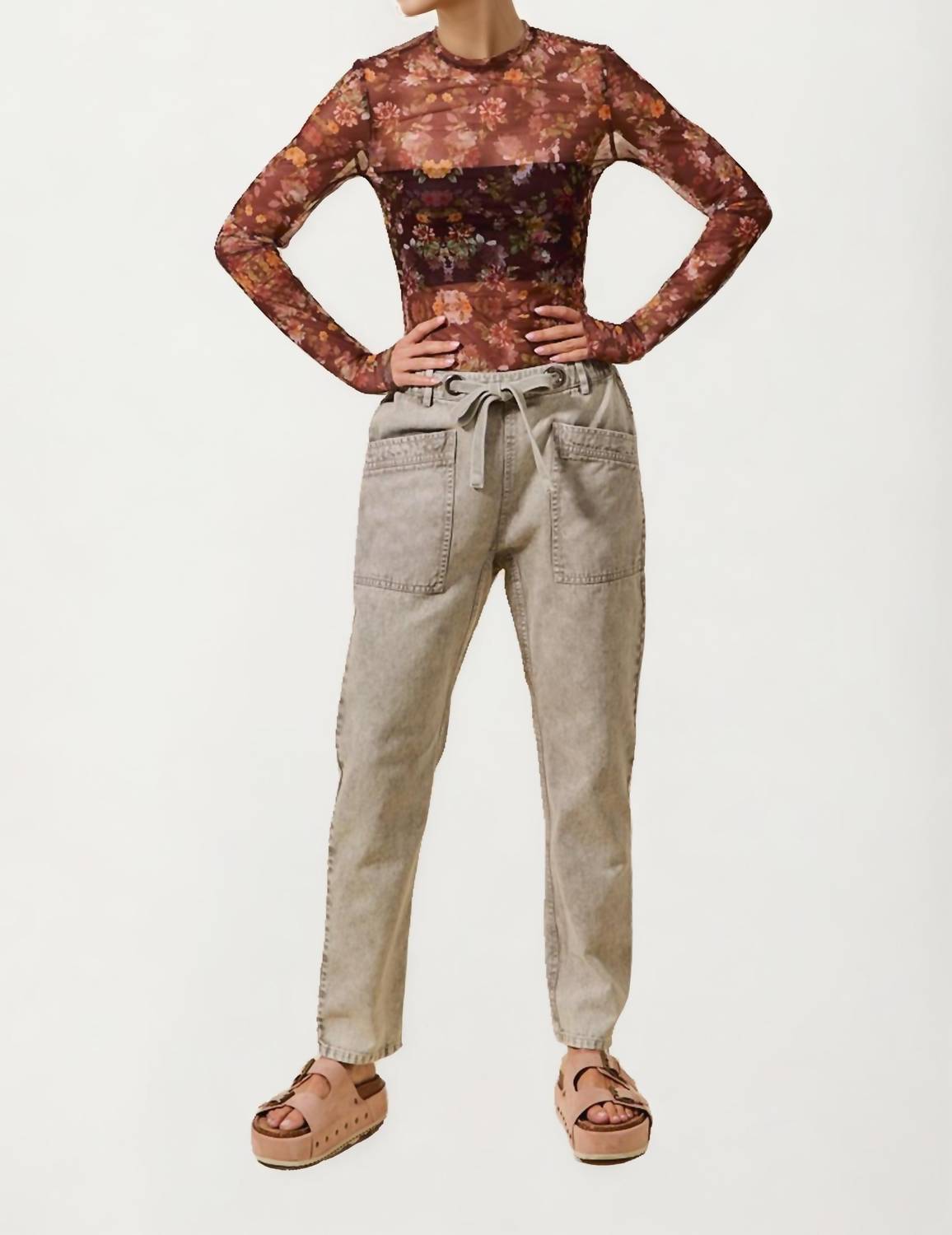 A straightleg pant that workes season after season. Dress these up with your favorite blouse or keep it casual with your go-to tee. Experience casual comfort with the High Rise Drawstring Denim Pants by Knit & Lounge, crafted from 100% cotton for ultimate ease and style. These pants feature a high-rise waist, pull-on closure, and oversized patch pockets, perfectly blending utilitarian and chic elements. Made in China, their 37"-39" length and straight leg design ensure a polished look that's versatile enough for back-to-school or workwear, in a solid beige hue. Care: Machine wash and tumble dry.
