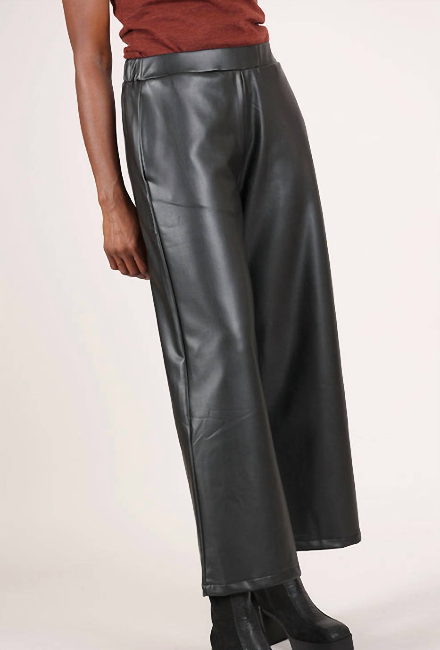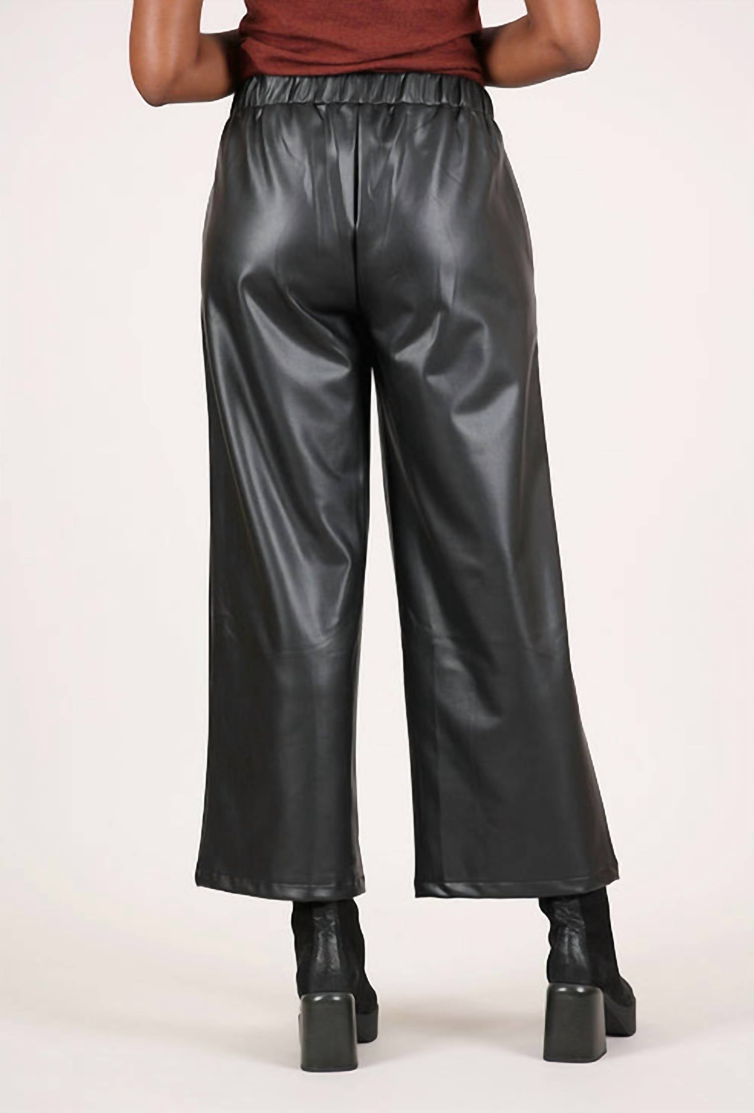 Elevate your evening style with the Renae Leather Wide Leg Pant by KOZAN, designed for the contemporary woman. Crafted from luxe faux leather, these pants feature a relaxed fit and a wide leg style, perfect for streetwear-inspired ensembles. Available in a solid black, they include convenient pockets and a pull-on closure for ease of wear. Care for these statement pants with dry cleaning to maintain their sleek appearance.