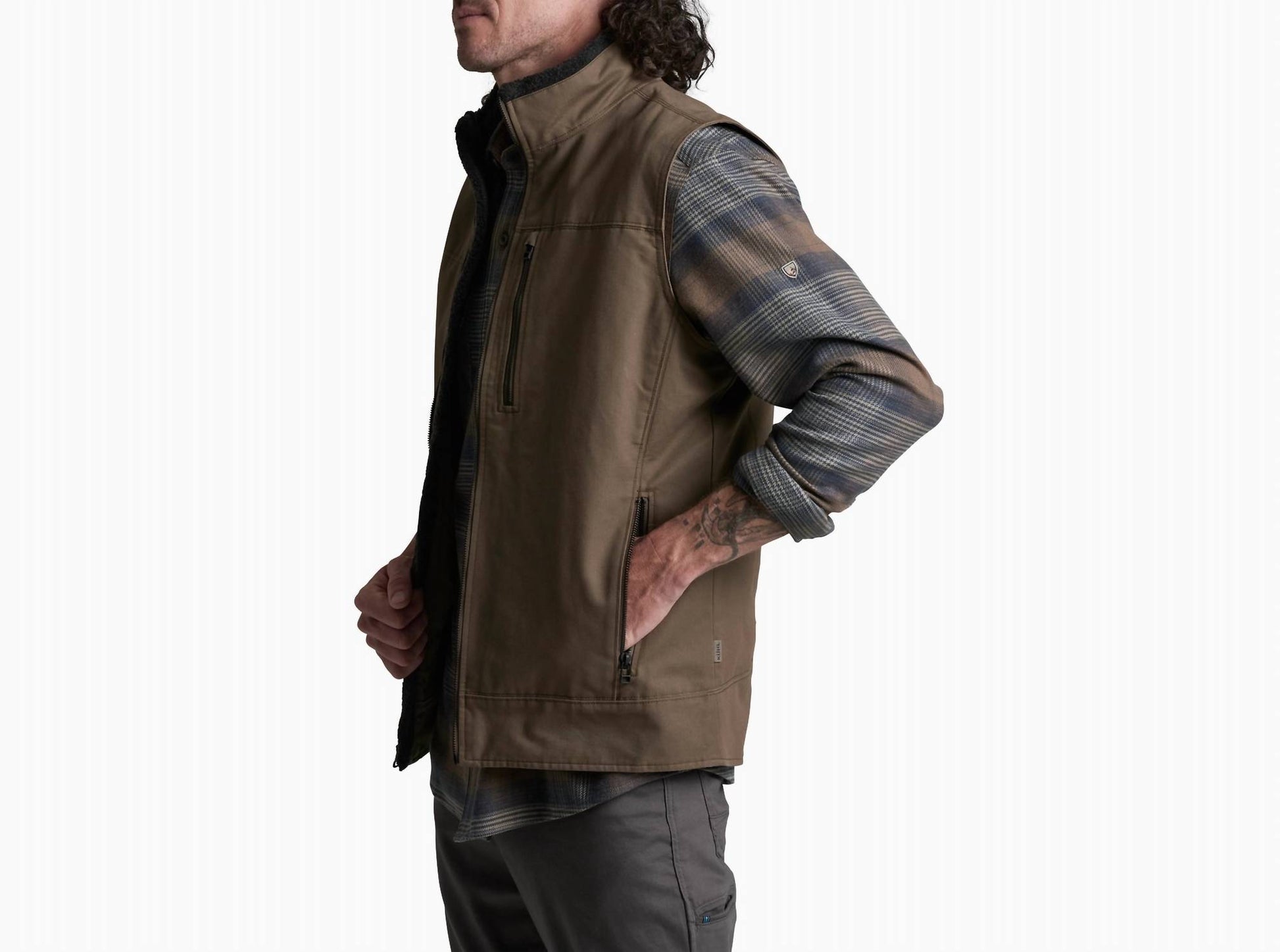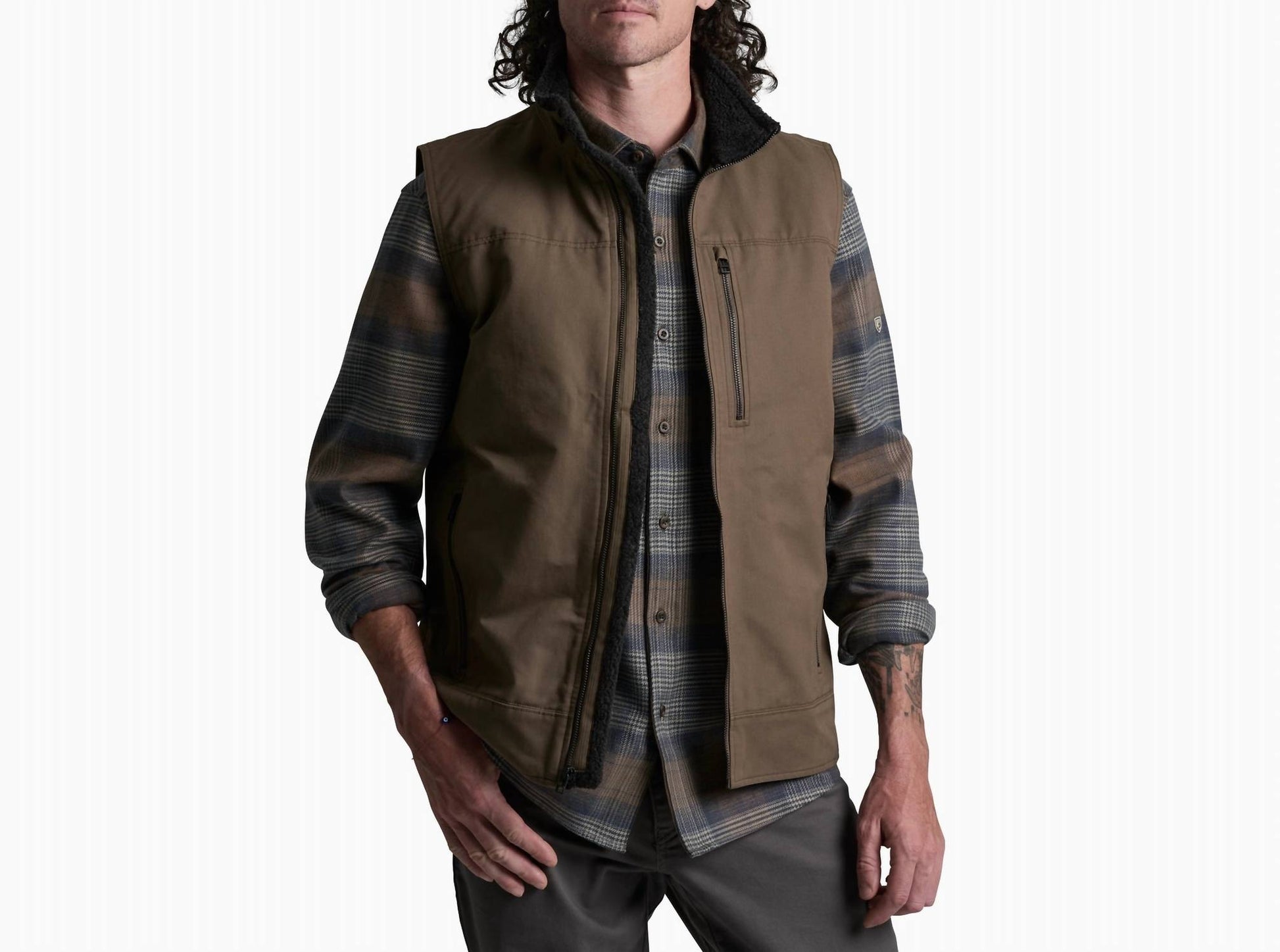 Experience the rugged style and durability of the KUHL Burr Zip Up Vest, perfect for travel or everyday wear. This sleeveless vest is crafted from 100% combed cotton canvas with a unique double patina dye process for a weathered look, complemented by Berber fleece accents for additional warmth. Complete with a full zip closure, it offers practical zippered hand-warming pockets and a chest pocket to securely keep your valuables. Imported and designed with core comfort in mind, it requires machine wash and line dry care with a center front zipper length of 28".