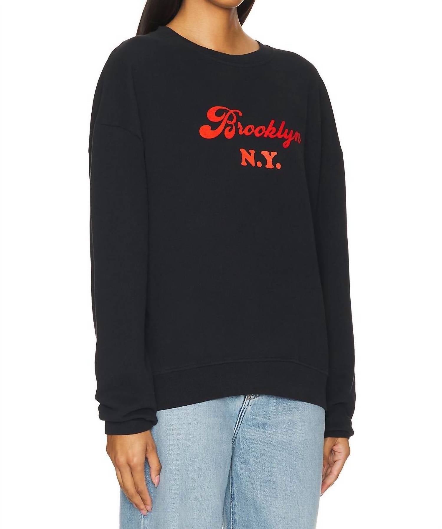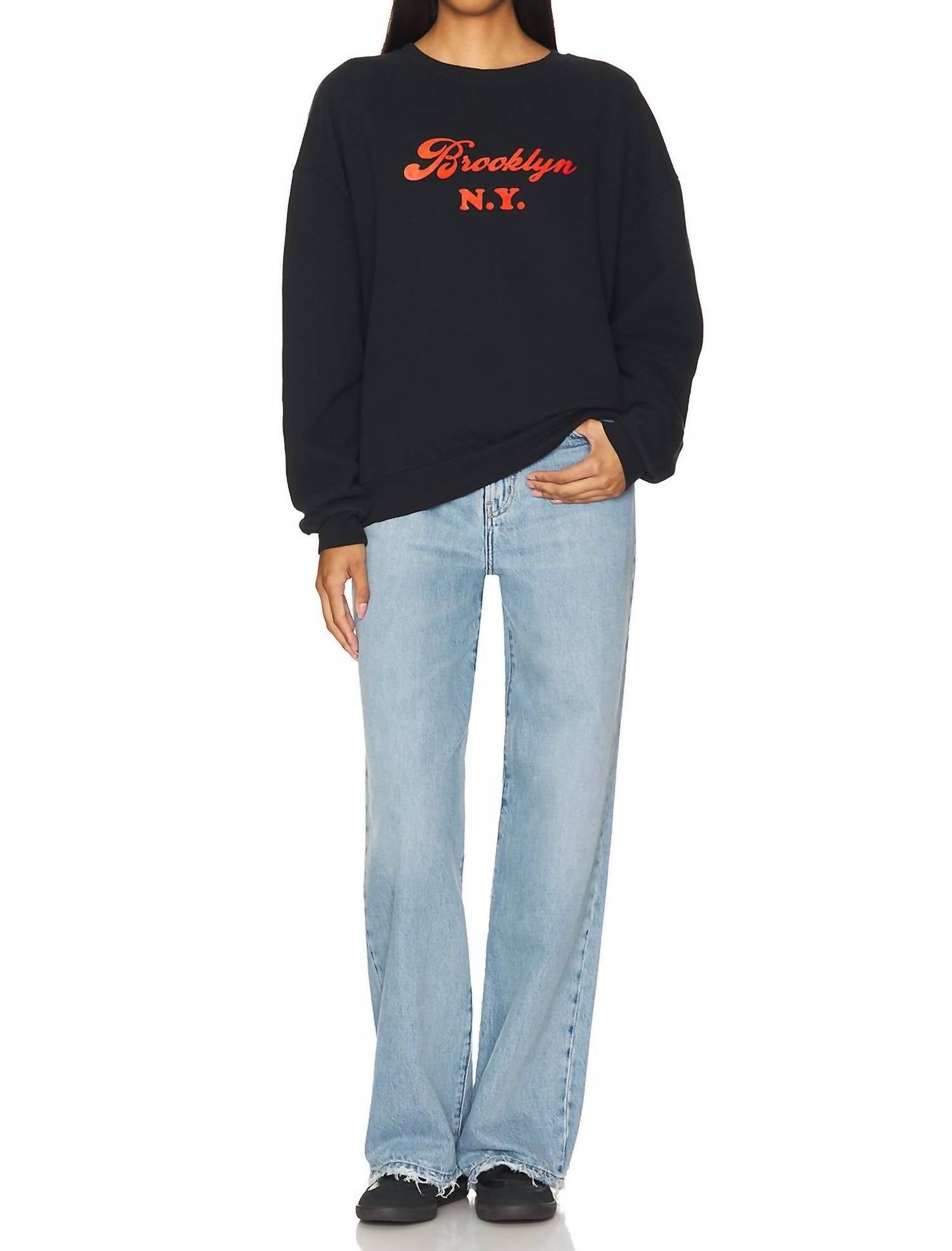 Whether you're running around town or lounging at home, this sweatshirt works for both. The Oversized Brooklyn Sweatshirt by KULE is a must-have for any streetwear lover, made from 100% organic cotton for supreme comfort. It boasts a long sleeve, drop shoulder design, and a classic crewneck, accentuated by a Brooklyn N.Y. flocked print. This stylish black sweatshirt is crafted in Portugal, ensuring quality and a chic, oversized fit. Easy to care for, it is machine washable and features a convenient pull-on closure.