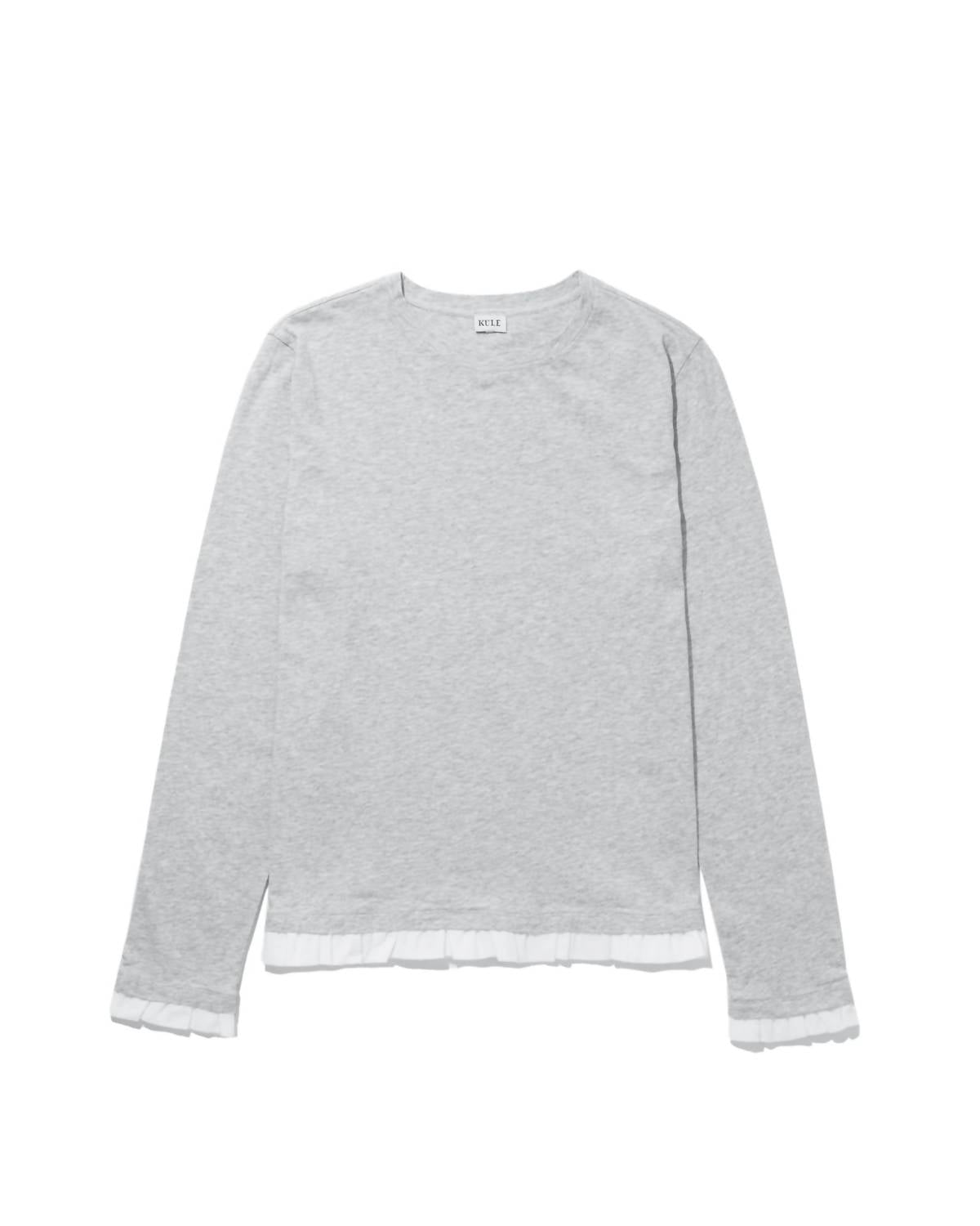 The perfect long sleeve tee that goes with just about anything. Embrace romance with the Romeo Long Sleeve Top by KULE, featuring a ruffled trim for a poetic touch. This lightweight, pull-on tee in Heather Grey/White is crafted from 100% cotton, ensuring both comfort and style. Designed with a relaxed crew neckline and straight cut, it hits at the hip for a flattering fit, making it perfect on its own or layered under a sweater. Made in Portugal, it's machine washable for easy care.