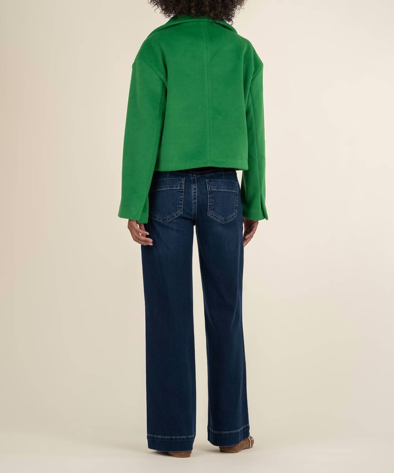 A casual yet cool jacket that every closset needs. Introducing the Harper Jacket by KUT FROM THE KLOTH, a chic and colorful addition to your fall wardrobe. This stylish long sleeve jacket in a vibrant green hue features a collar and button closure. With a composition of 90% Polyester and 10% Viscose, it measures 22 inches from the high point of the shoulder, making it perfect for contemporary, playful layering. Care instructions recommend hand washing and laying flat to dry for best results. Model is 5'10" wearing a size Small (Bust 32", Waist 24", Hips 34").