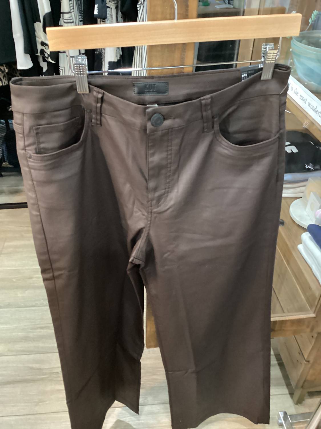 Introducing the Meg High Rise Fab Ab Wide Leg Pants by KUT FROM THE KLOTH, a stylish choice in a rich chocolate hue designed for comfort and flair. These pants offer a high-rise fit with a flattering button closure, featuring Fab Ab front pockets to shape and smooth. Crafted from a blend of 59% Modal, 39% Polyester, and 2% Lycra, they boast a wide-leg style with a 29.5" inseam and 23" leg opening, perfect for any holiday party this fall. Care instructions include machine wash and tumble dry for easy maintenance.