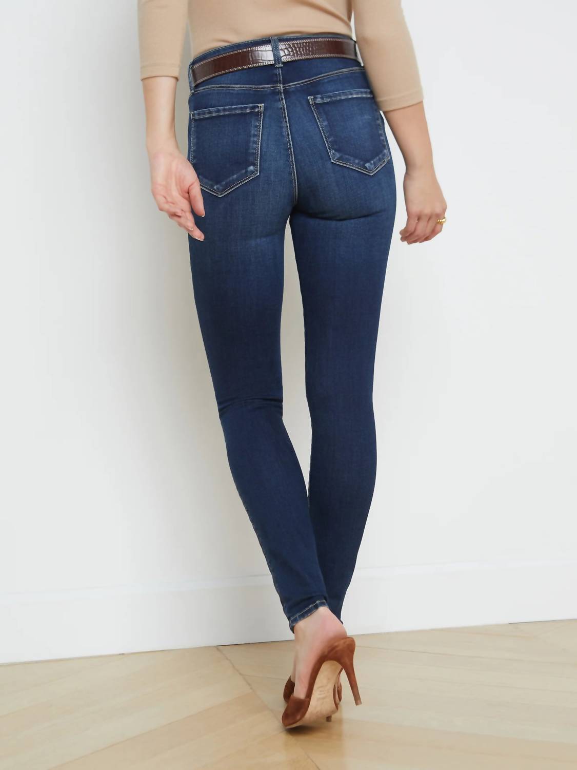The perfect skinny jeans to wear with your favorite boots this season! Introducing the Marguerite High Rise Skinny Jeans by L'Agence, crafted in Columbia blue from a premium cotton blend featuring 25% REPREVE polyester, a sustainable recycled fiber. Tapered from hip to ankle, the jeans boast a 9.5" rise and a 30" inseam, hugging your silhouette beautifully while maintaining comfort with super-stretch denim. With a classic 5-pocket design and zip closure, these jeans not only enhance your style but also showcase meticulous whiskering and hand-sanding on the hip and thigh. Made in Los Angeles, care for them easily with machine wash and tumble dry instructions. Model, standing at 5'10" with a 32" bust, 24" waist, and 34.5" hips, is wearing size 25.