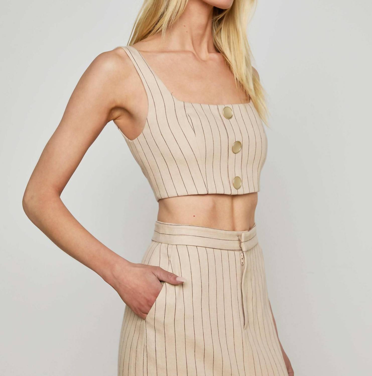 Pair this crop top with your favorite high-waisted jeans or maxi skirt. Introducing the Maylin Pinstriped Bralette Top by L'Agence, an effortless blend of tailored style and relaxed polish for holiday parties. This sleeveless top showcases a chic squareneck, wide straps, and decorative bold gold buttons against a tan and brown stripe pattern. Crafted from a premium linen blend composed of 52% Linen, 30% Cotton, 17% Rayon, and 1% Metallic, this imported piece features a 14.25" length and an exposed back zip closure. Care: Dry clean only.