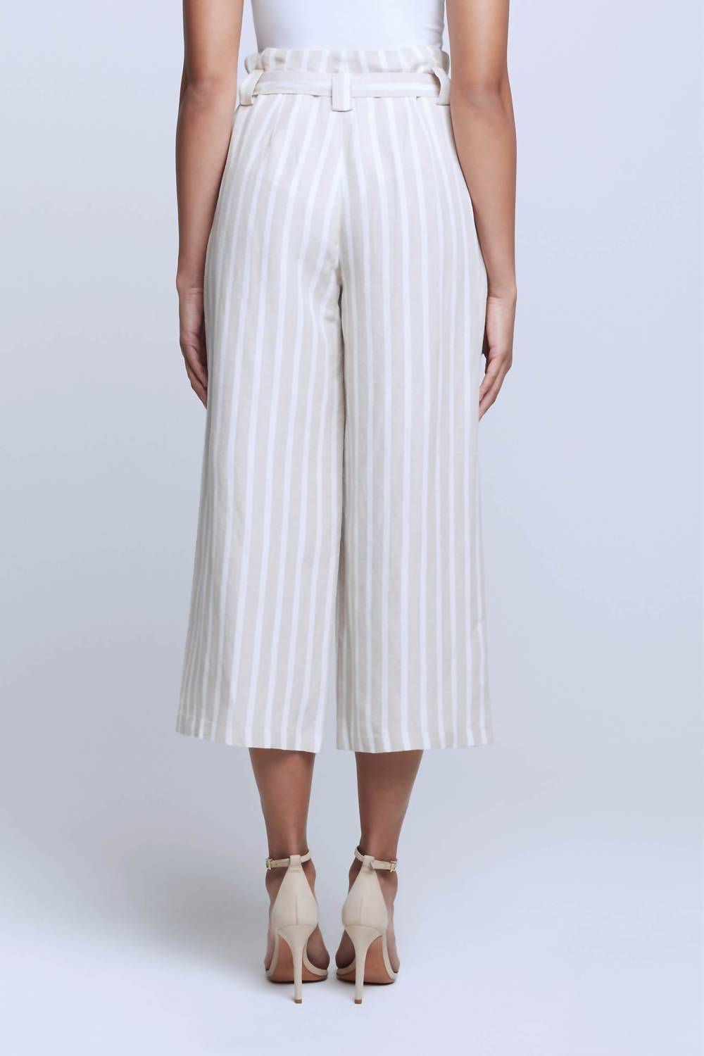 Embrace effortless sophistication with the L'Agence Samira Linen Paperbag Pant in soothing bisque and ivory stripes. These cropped wide-leg trousers feature a delightful paperbag waist with a removable sash and boast a relaxed, high-rise fit. Crafted from a 55% linen and 45% rayon blend, they offer front slant pockets for added functionality. Closure: Zip fly with hook-and-bar; Care: Dry clean or hand wash, line dry—a perfect addition to your summer wardrobe.