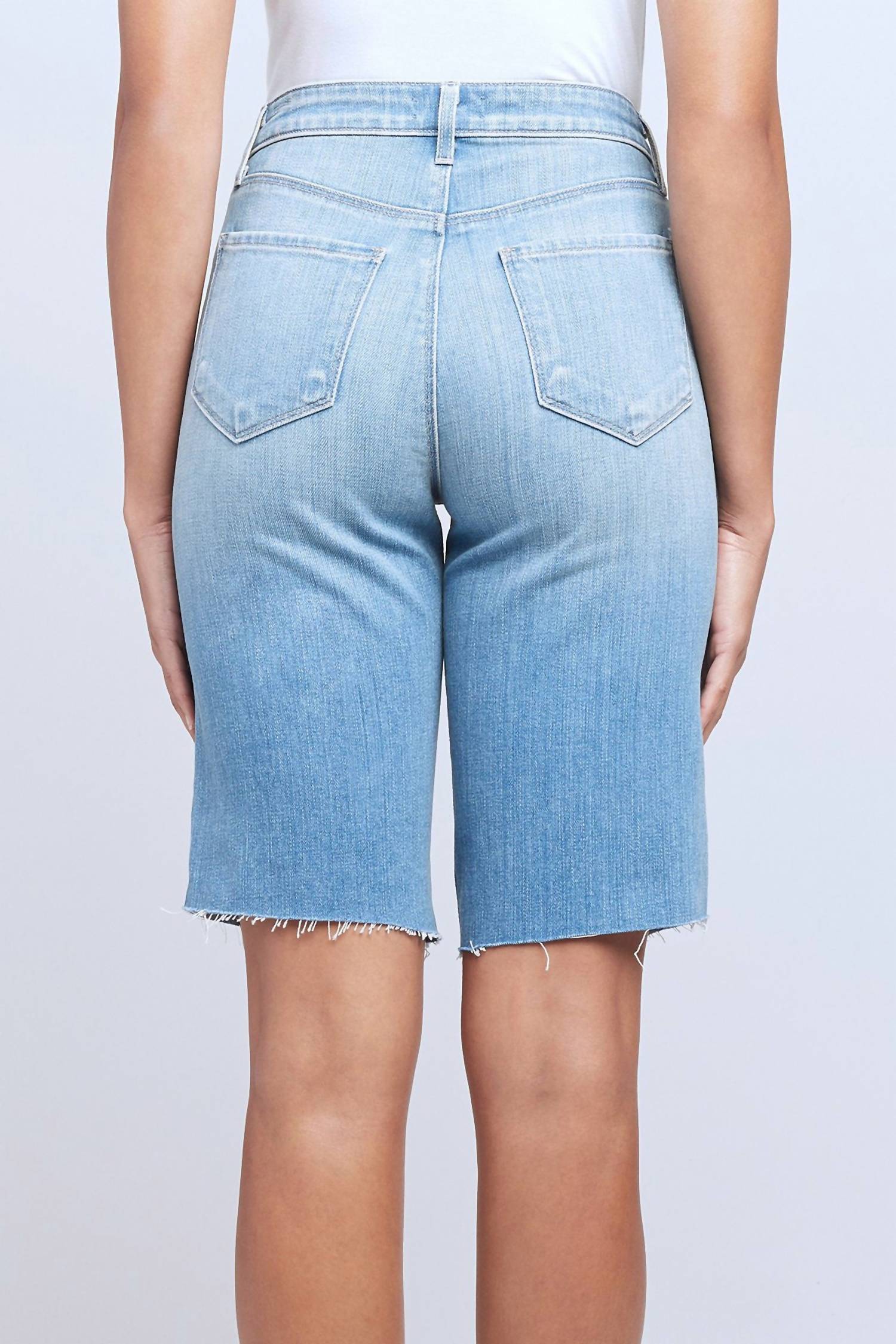 You can never have too many jean shorts and these will be your new favorites. The L'Agence Taylor High Rise Short in Ashford is a must-have for your summer wardrobe, blending style and comfort effortlessly. With a composition of 94% cotton, 5% polyester, and 1% spandex, these shorts boast a solid pattern and a cotton blend. Made in the USA, they feature a zip fly with a button closure and practical 5-pocket styling. Care instructions include machine washing, and the shorts measure approximately 53 cm in length, finished with a trendy frayed raw cut hem.
