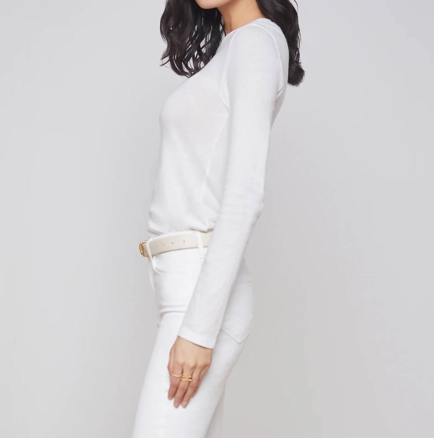 The perfect long sleeve tee that goes with just about anything. Introducing the Tess Long Sleeve Tee by L'Agence, a luxurious slim-fit top in an elegant white hue. Crafted from ultra-soft microfiber jersey, it consists of 93% Rayon and 7% Spandex, offering a silky feel that lightly clings to your figure. With a chic crewneck and sleek long sleeves measuring 23.75", this piece is made in Los Angeles and measures about 25.75" from shoulder to hem. Designed for versatility, it features a convenient pull-on closure and is perfect for travel or as a stylish layering piece. Care instructions: Hand wash only. Model wears size XS (5'10" height, 34" bust, 24" waist, 35" hips).