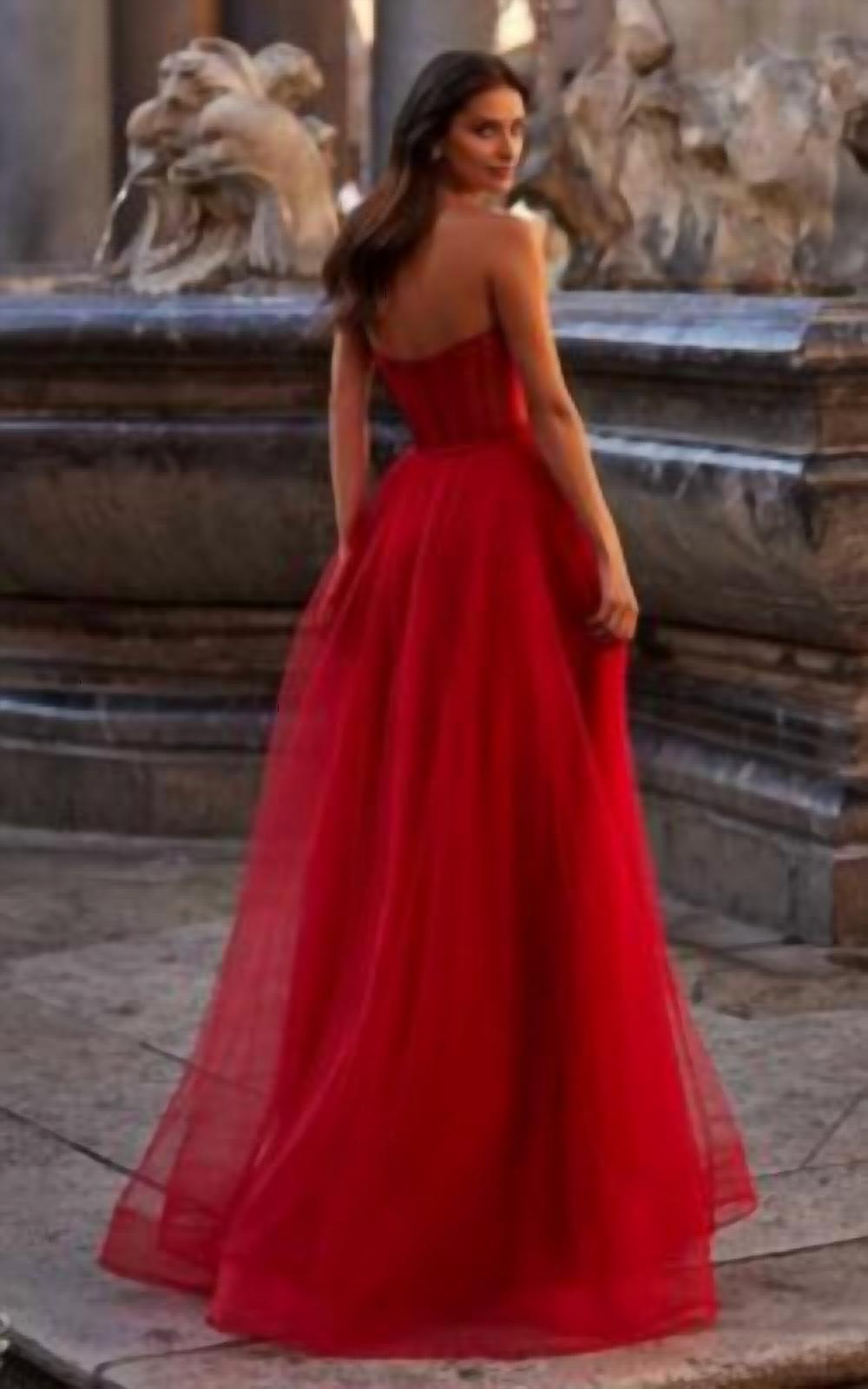 No straps necessary! La Femme red strapless a-line toole ballgown with sweetheart neckline corset and side slit. Zipper back closure. Runs small. Dry clean.