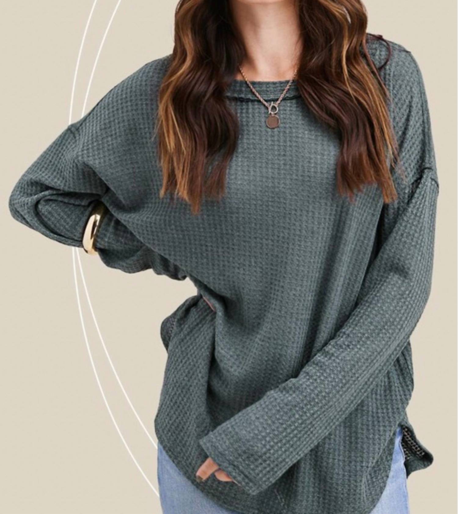 A classic staple that every closet needs. The Bree Long Sleeve Waffle Weave Casual Top by LA MIEL in refreshing teal combines comfort with boho elegance, perfect for a preppy travel look. This textured top features long sleeves, a relaxed fit with a split hem, and raw edge details for added style. Crafted from a soft blend of polyester, rayon, and spandex, it offers an effortless pull-on closure and a crew neckline. Ideal for casual occasions and lounging, this versatile piece suits any wardrobe for the fall season or a stylish New Year's Eve.