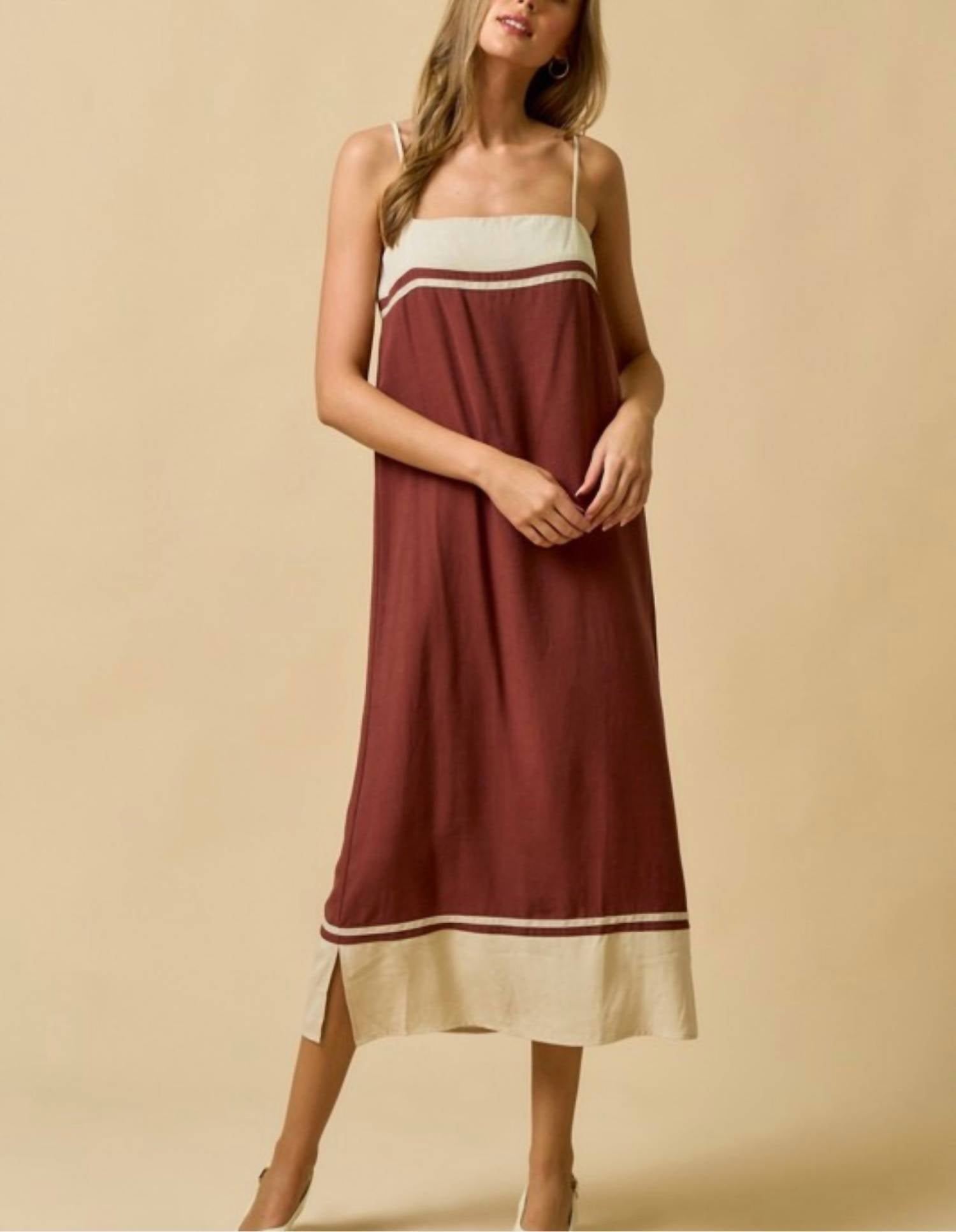 A flattering yet comfortable dress you'll be reaching for season after season. The Color Block Midi Dress by Lalavon showcases a Boho Chic flair, ideal for a stylish Beach Day. Designed with spaghetti straps and contrast stripe detailing, this slip dress features adjustable straps for a customized fit. Made from Rayon, it boasts a midi length in an eye-catching Brown & Cream color palette. Care instructions recommend hand washing and line drying to keep it looking its best all summer season.