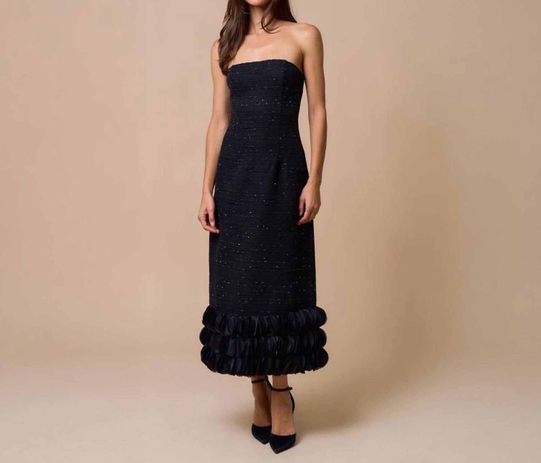 Who doesn't love a good maxi dress? This one you'll be reaching for season after season. Elevate your evening wardrobe with the Lalavon Tweed Strapless Maxi Dress, designed in a sophisticated black shade. This strapless sheath dress is crafted from 97% Cotton, 3% Elastane, offering both comfort and style with its modern pattern. The dress features an off-the-shoulder neckline and a zip closure, making it an ideal choice for fall evening events. For care, it's recommended to dry clean this timeless piece.