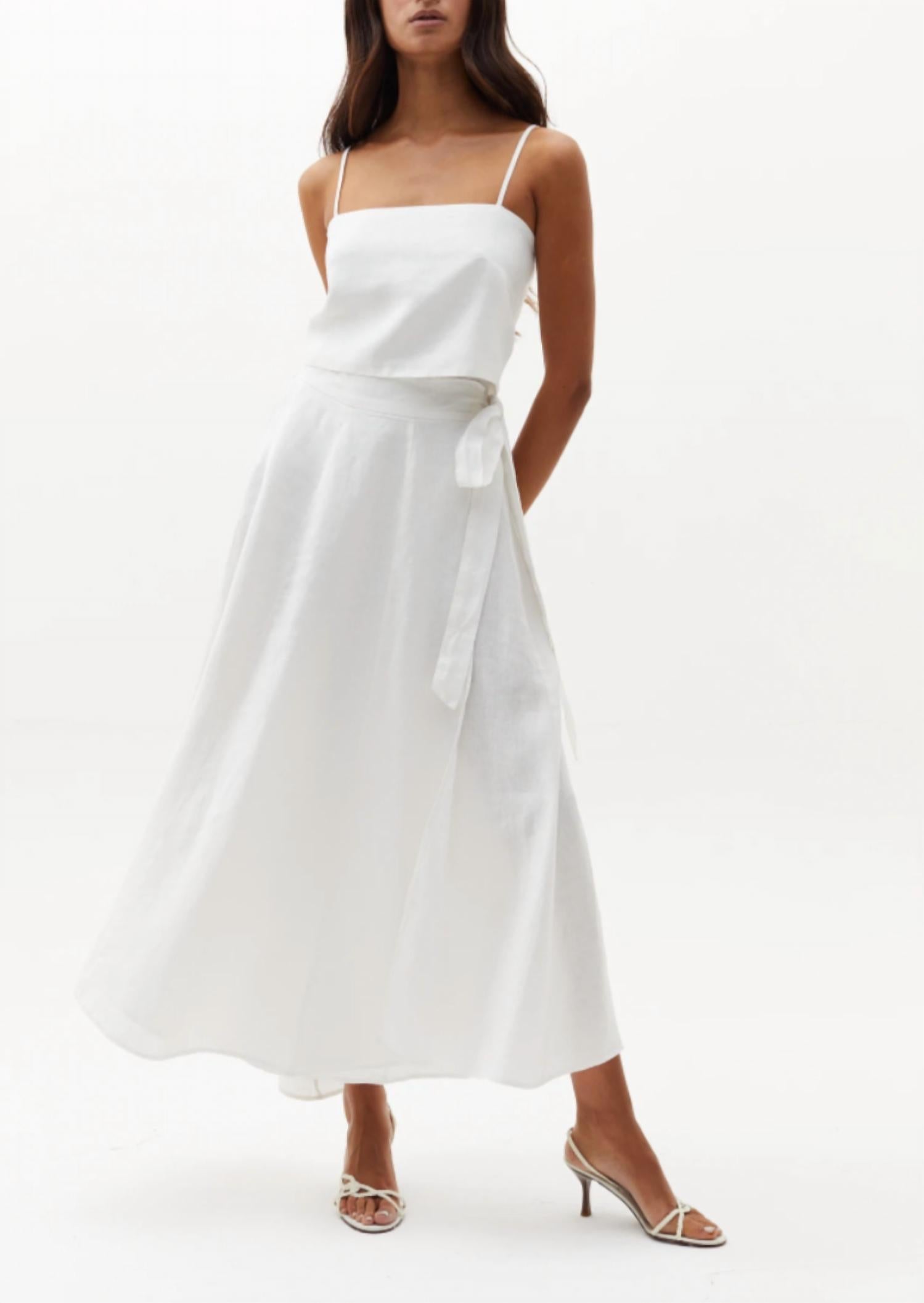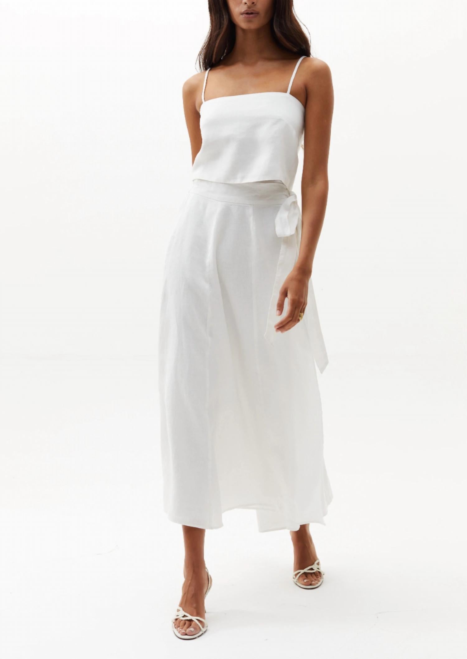 Discover the Lola Wrap Skirt by Lanhtropy, a chic summer staple in a crisp white hue. This maxi skirt is crafted from 100% organic linen, promising a lightweight and breathable fit, with a tied closure and an elastic waistband at the back for adjustability. Its feminine silhouette flows elegantly, designed slightly longer at the back for added drama. Machine wash cold, lay flat to dry, and iron at high temperature for best results.