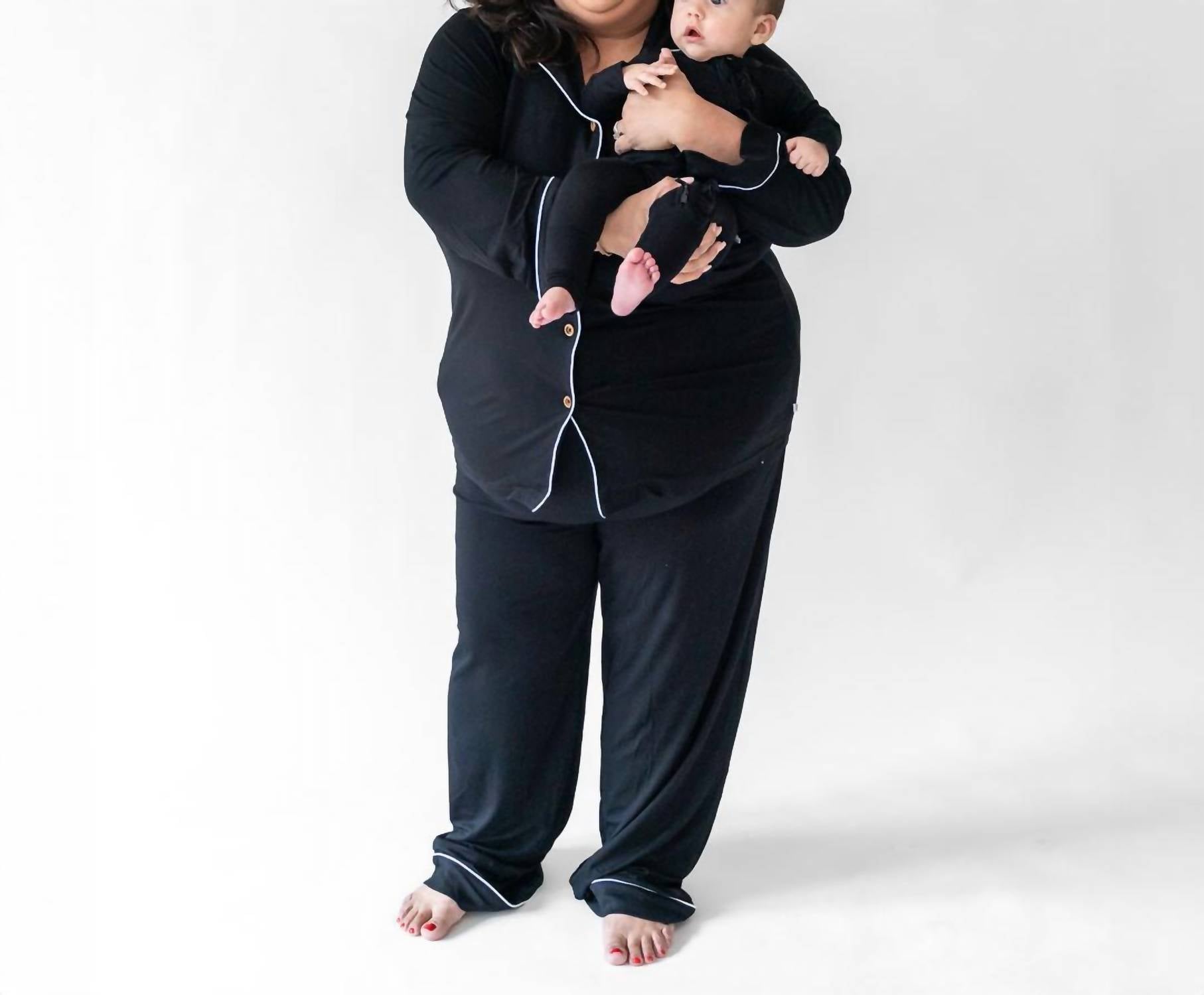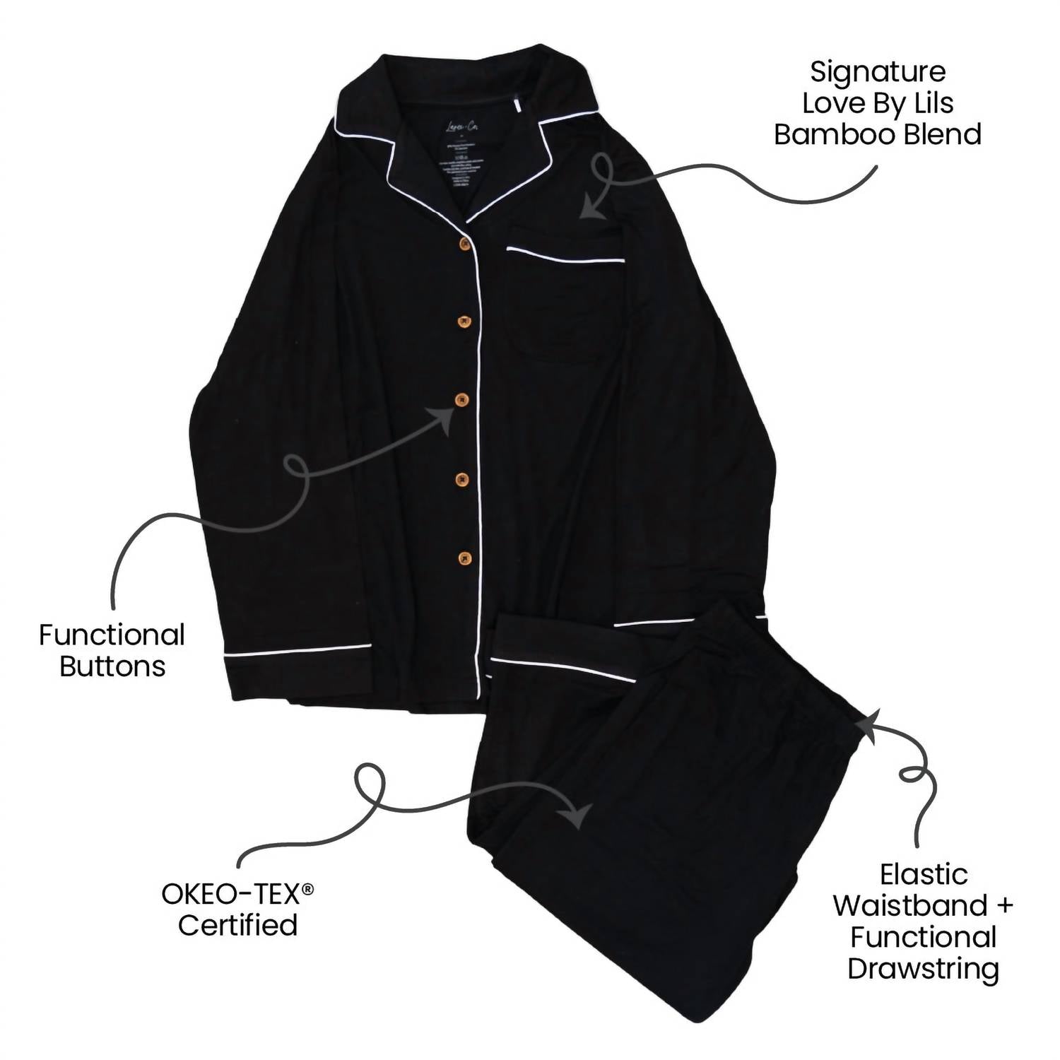 Loungewear doesn't have to be frumpy and this is exactly what we had in mind. Designed for a comfortable fit, this chic little number will be your favorite lounging-at-home look. Discover ultimate comfort with the Allie Bamboo Luxe Lounge Set by Laree + Co., designed for an elevated lounging experience. This black loungewear set features a long sleeve top paired with matching bottoms that boast a drawstring waist and pockets for convenience. Made with 95% bamboo and 5% spandex, this set is both breathable and stretchy. Care for your set with a delicate wash cold and tumble dry low to maintain its lasting softness, and enjoy the added perk of matching designs with our baby and kids collection.