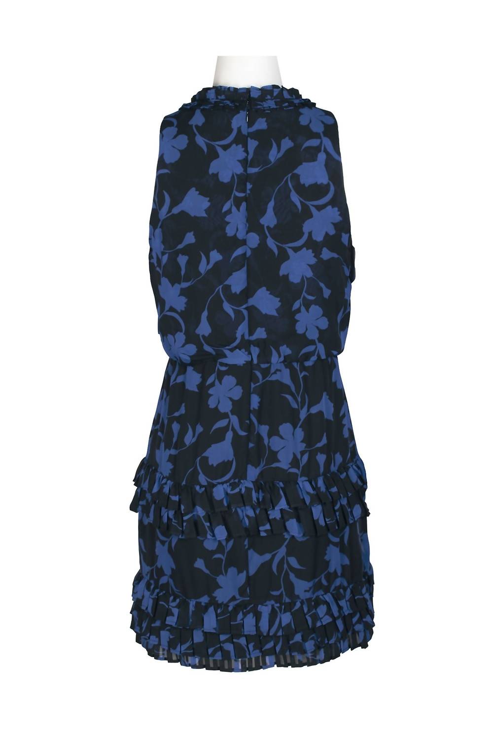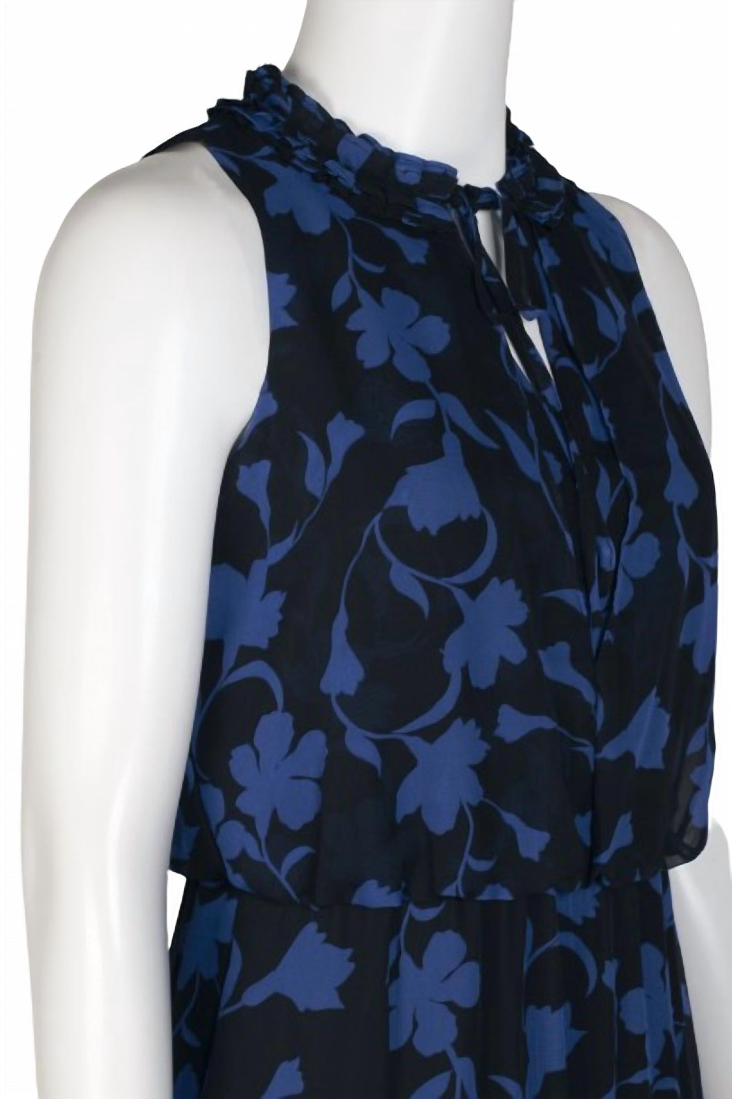 Cute and comfortable, this long sleeve dress has it all. Introducing the Pleated Blouson Tiered Hem Chiffon Dress by Laundry by Shelli Segal, a sophisticated addition to your wardrobe in Black Azure. This sleeveless dress features a flattering mock neck blouson and a feminine tiered hem that exudes elegance and movement. Made from lightweight chiffon with a floral pattern, it provides both style and comfort with a polyester lining. Zip closure. Dry clean recommended. Perfect for cocktail and beach parties, this dress is designed for versatility and ease.