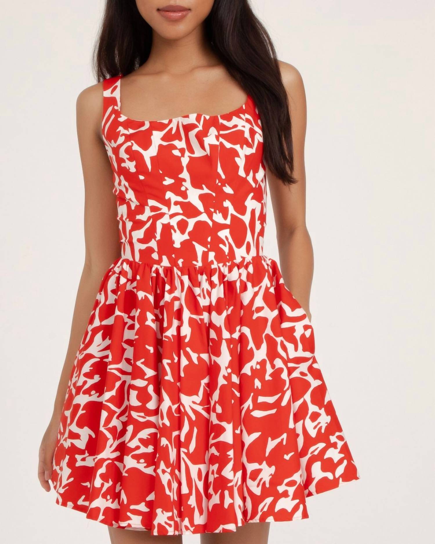 A short and breezy dress for those warmer days. Elevate your summer wardrobe with the Jenesis Mini Dress by LAVENDER BROWN, perfect for a vacation or a memorable Valentine's Day. This sleeveless dress showcases a vibrant red and white pattern in a fit-and-flare silhouette with a stylish squareneck. Enjoy the practical addition of pockets for convenience. Crafted with care, this dress should be dry cleaned to maintain its chic look. Made for women who appreciate a maximalist trend.