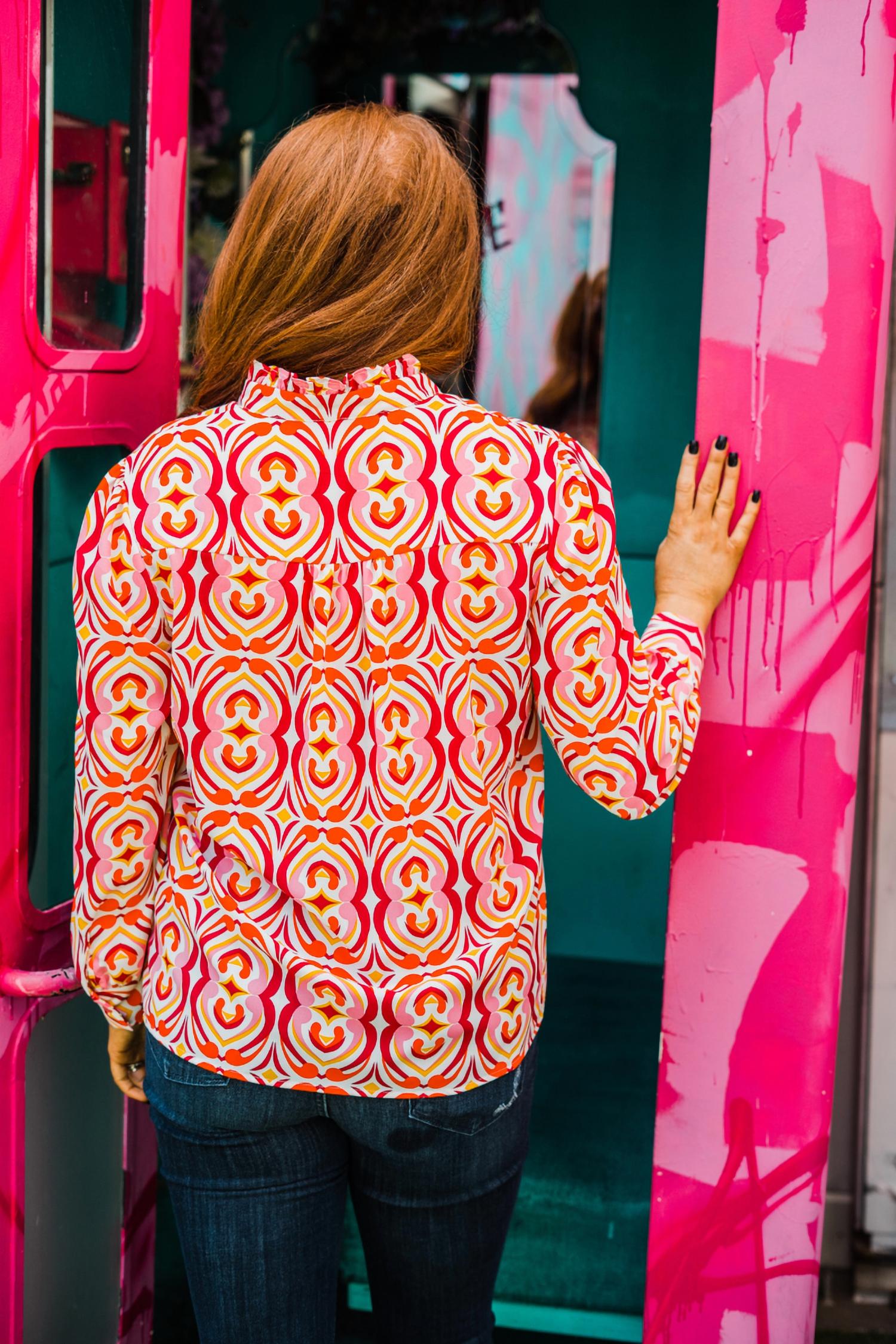 A long sleeve top you can wear with denim, skirts, well... just about anything! Elevate your wardrobe with the Carmen Long Sleeve Top by Layerz Clothing in a striking multi-color geometric print. This women's top features long sleeves and a flattering crewneck, perfect for making an impression at any holiday party. Crafted entirely from polyester, this piece is designed with comfort in mind and offers easy maintenance with dry clean care instructions. With a length ranging from 27 to 29 inches depending on size, it's ideal for a maximalist spring look that stands out.