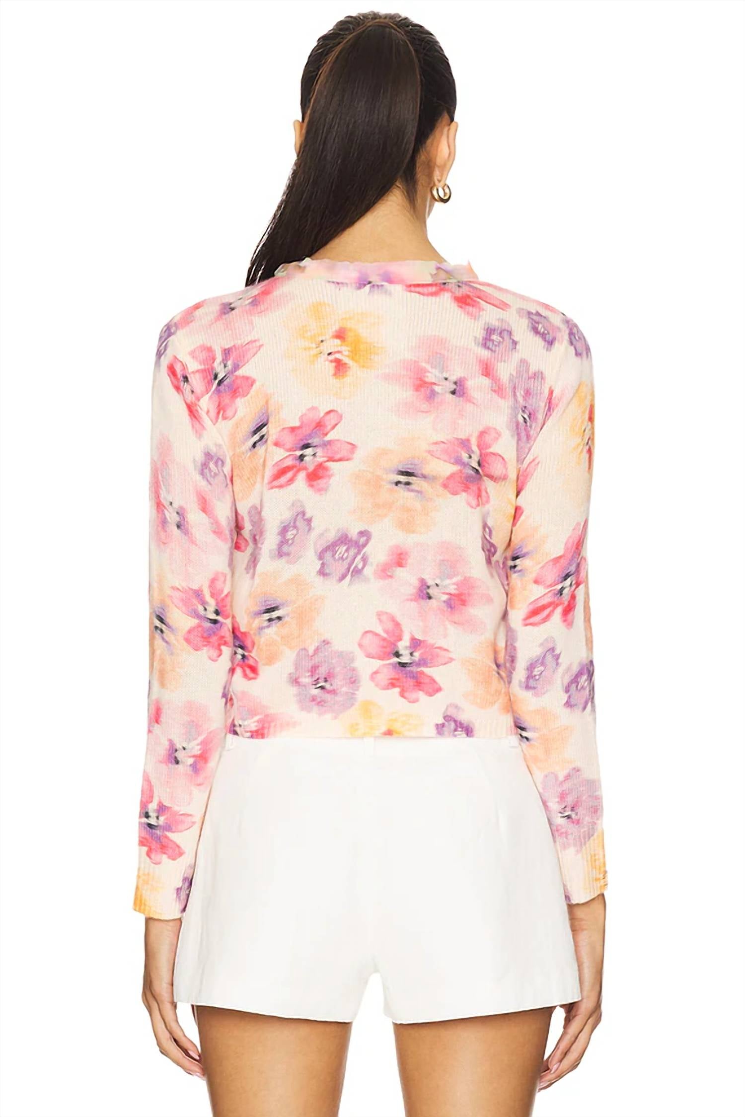 A classic fit that works just as good buttoned as it does left open. Introducing the Coquette Floral Cropped Sweater by LE SUPERBE, a springtime essential for your wardrobe. Featuring long sleeves, this romantic cardigan is made from a luxurious blend of 70% wool and 30% cashmere. It boasts a cropped length that perfectly complements its soft pastel floral knit and is designed with a sparkling jeweled placket and snap closure.