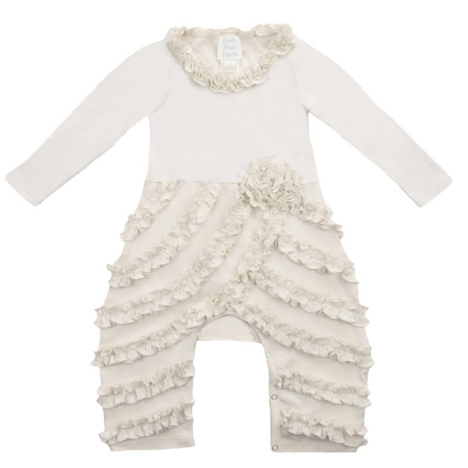 Adorn your little one in the charming Baby Girls Peony Romper by Lemon Loves Layette, featuring a delightful eggnog beige hue perfect for spring occasions. Crafted from 100% Peruvian cotton, this romper is not only comfortable but also stylish with its signature ruffles embellishing the neckline and legs, complemented by a sweet flower accent at the waist. Made in Peru, it embodies minimalist elegance with a solid pattern and timeless appeal. Ideal for birthdays and festive celebrations, it's a one-of-a-kind piece designed with attention to detail.