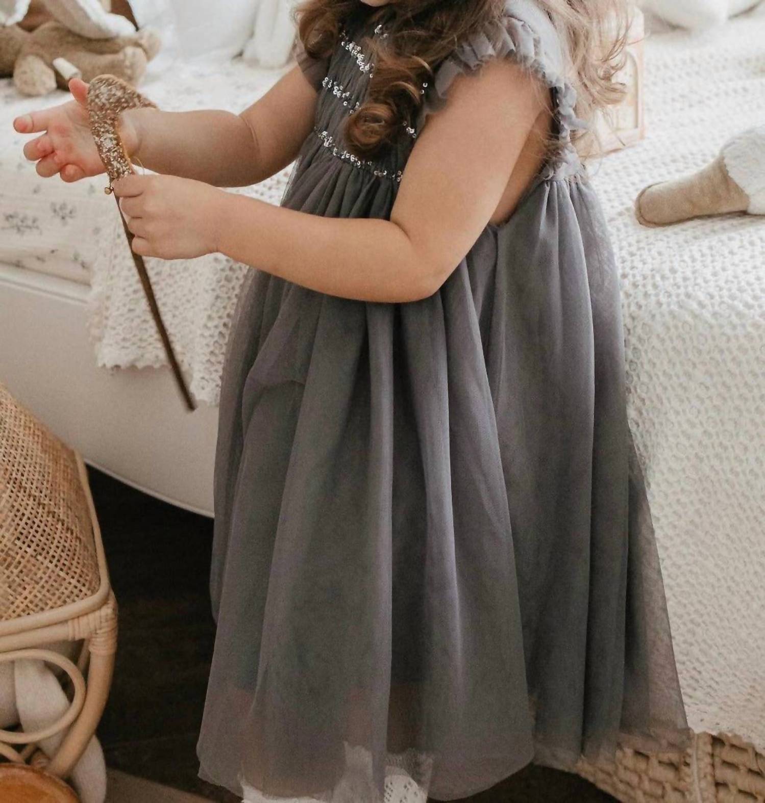 Presenting the Scarlett Cotton Tulle Dress by Lepela, a charming piece in a sophisticated Sleet Gray color perfect for a spring holiday party. Designed for young fashionistas, this dress features tulle detailing on the collar and sleeves with an embellished chest, offering a loose fit and convenient zip back closure. Crafted from 100% OEKO-TEX certified cotton with a tulle outer layer, this piece is made in India with natural, non-toxic dyes. The model is 3 years old, 42 inches tall, wearing a size 4Y, and it's sized true to fit for a minimalist casual look.