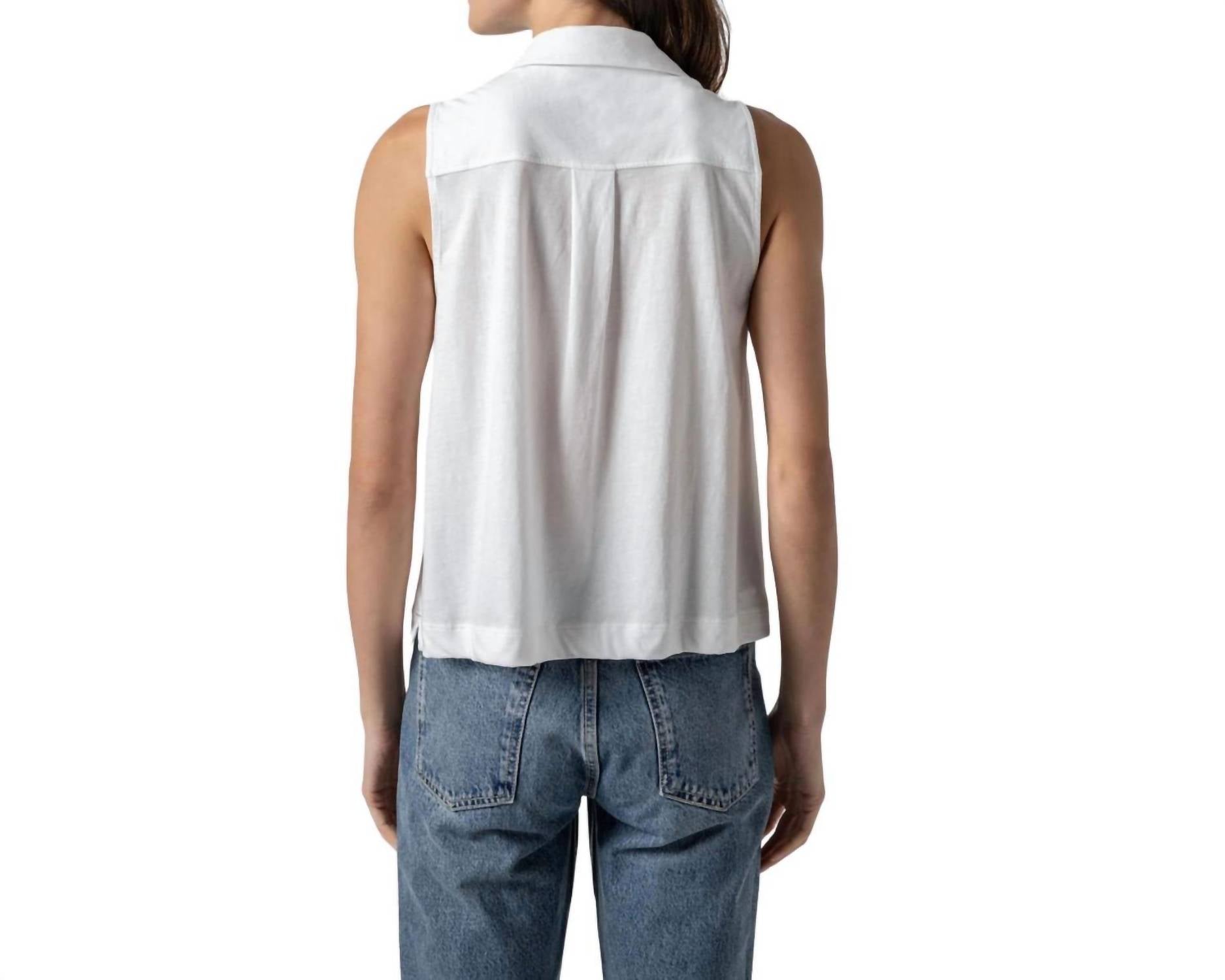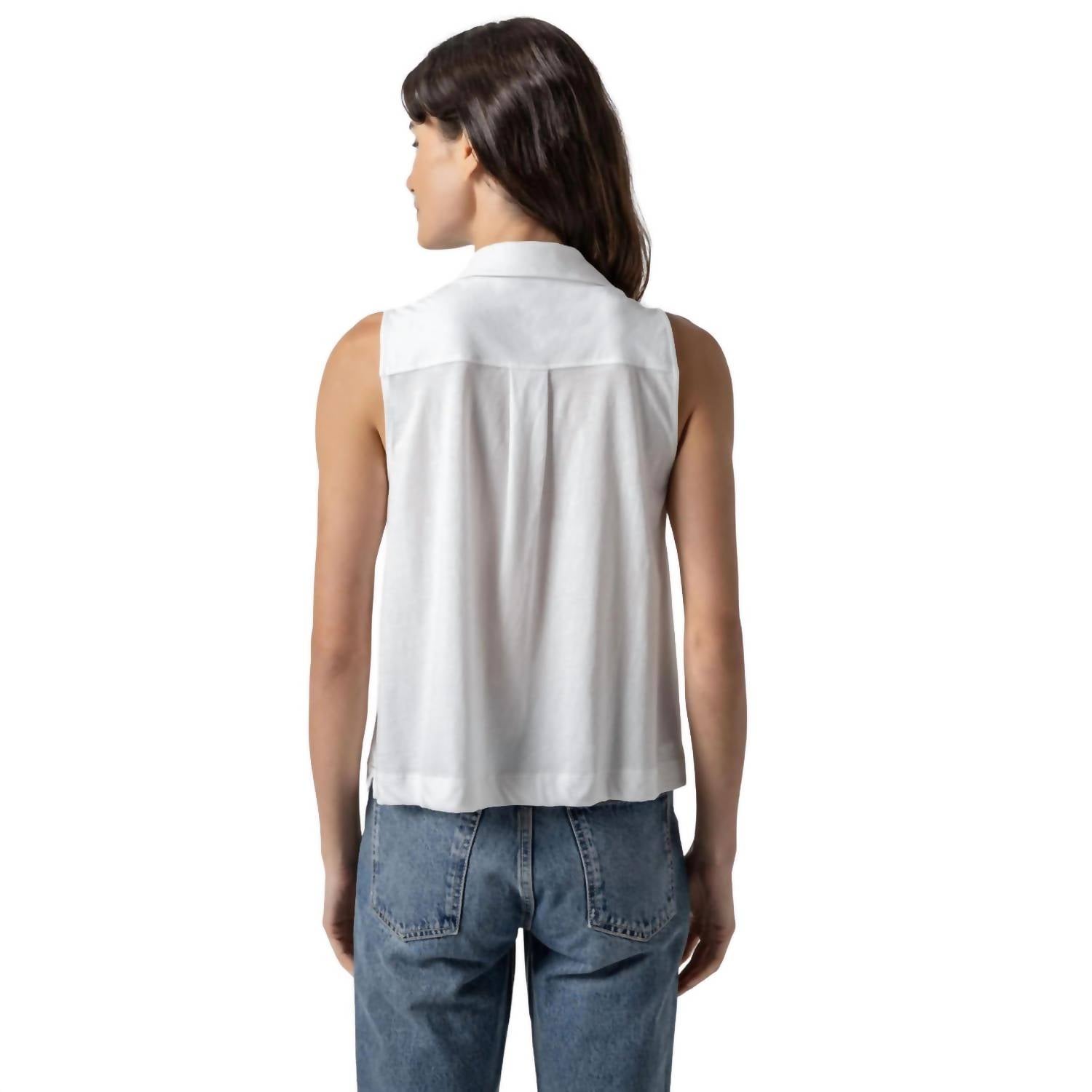 A timeless blouse that will never go out of style. Discover effortless elegance with Lilla P's Sleeveless Button Down Blouse, a minimalist must-have for your summer wardrobe. Crafted from lightweight cotton, this solid white top offers a chic collar neckline and a practical button closure. With a garment length of 22 inches, it's perfect for back-to-school and casual occasions alike. Care is simple with machine wash and line dry instructions.