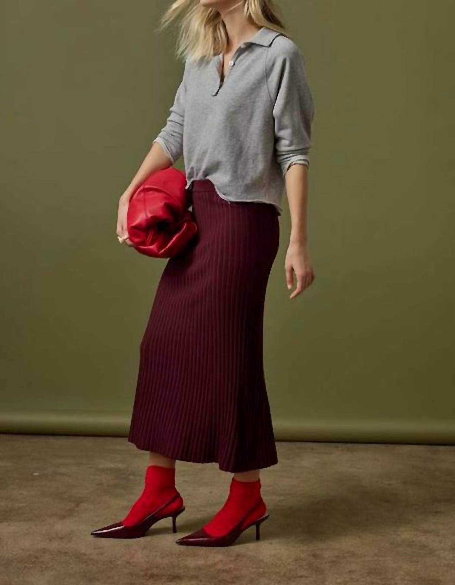 Embrace the warmth of fall with the Lilla P Straight Rib Skirt in a rich Dark Cherry hue, perfect for any dinner party. This women's midi skirt features a ribbed knit design with convenient pull-on styling, making it a minimalist yet chic choice for the season. Crafted from a blend of 49% Viscose, 30% Polyester, and 21% Nylon, it promises comfort and ease of movement. Care for this solid-patterned A-line skirt by hand washing cold and laying flat to dry, or opt for dry cleaning to maintain its elegant appearance.