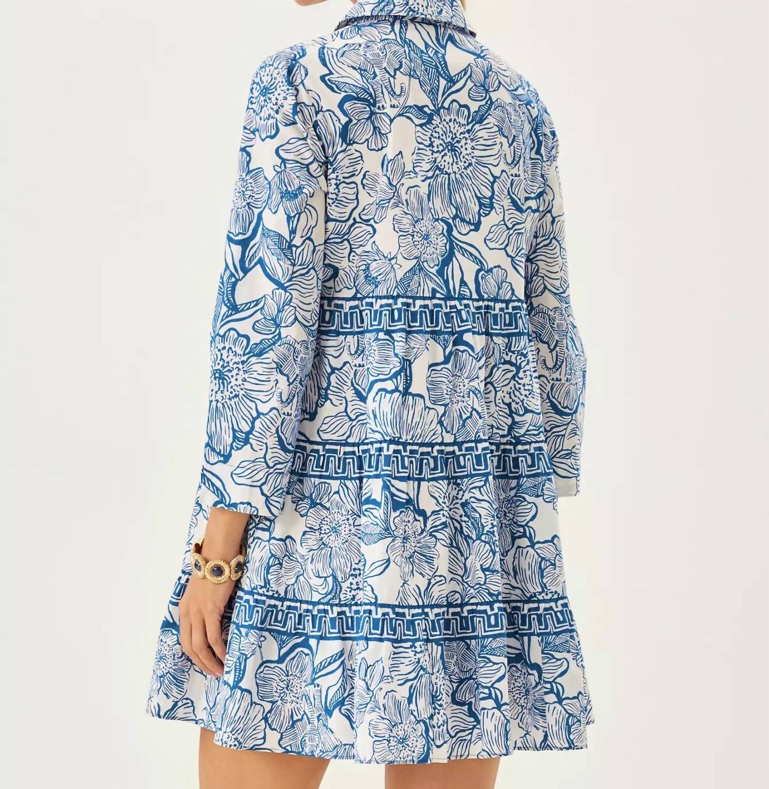 The kind of easy and flattering dress you'll be reaching for all season long. Embrace effortless elegance with the blue Angie Shirtdress by Lilly Pulitzer, an exquisite choice for cocktail parties this spring. Featuring long sleeves, a shift silhouette, and a tiered design, this dress pairs a stylish collar with functional button closures and side seam pockets for practicality. With a flattering swing fit, it measures 36" from the top of the shoulder to the hem in a size small/4 and is imported to ensure quality craftsmanship. Please note the actual color may vary slightly due to the vibrancy of Lilly Pulitzer's hues.