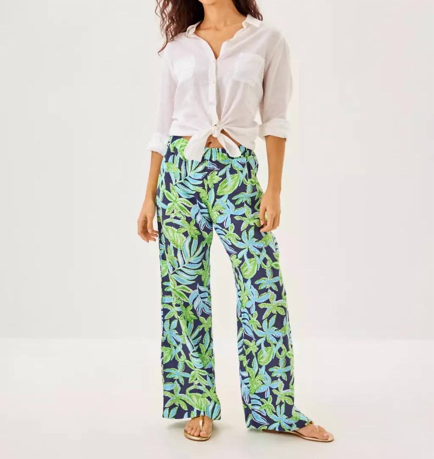 Elevate your summer wardrobe with the Daylen Linen Palazzo Pants by Lilly Pulitzer, perfect for vacation-ready looks. These high-rise, pull-on pants feature a wide leg silhouette in a vibrant Sapphire Pool Tropical Tango floral pattern. Tailored from luxurious linen, the pants boast a relaxed fit with a 31" inseam, making them a stylish and comfortable choice. Made for the fashion-forward, they are an imported piece that brings the tropical spirit to any outfit.