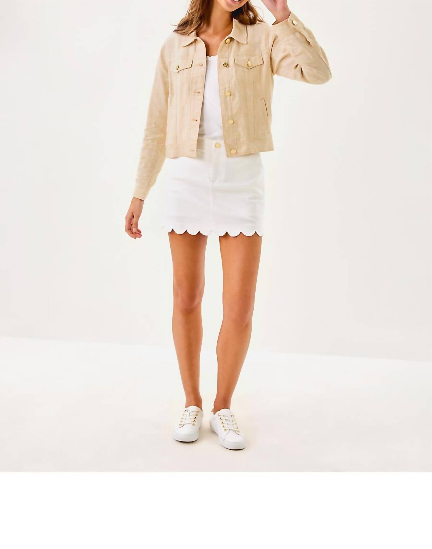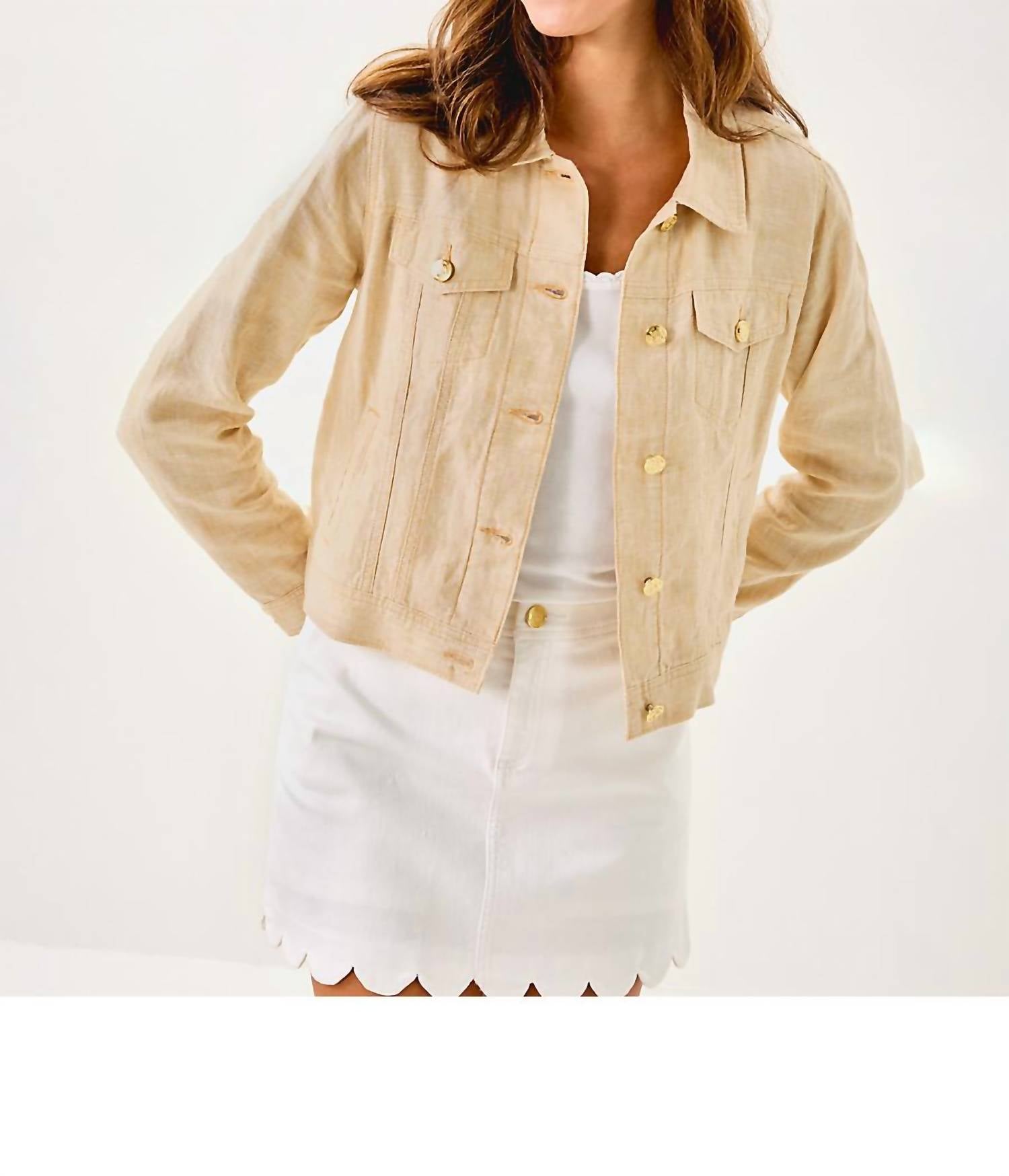 A casual yet cool jacket that every closset needs. Elevate your spring travel wardrobe with the Seaspray Linen Jacket by Lilly Pulitzer, featuring a Solid pattern in Wicker Tan and Resort White. Crafted from breathable Linen, this jacket offers practical elegance with its long sleeves, classic collar neckline, and functional pockets. Designed with a button closure, it embodies minimalist charm while being easy to care for with machine wash instructions. Ideal for women seeking a blend of style and comfort for their next adventure.