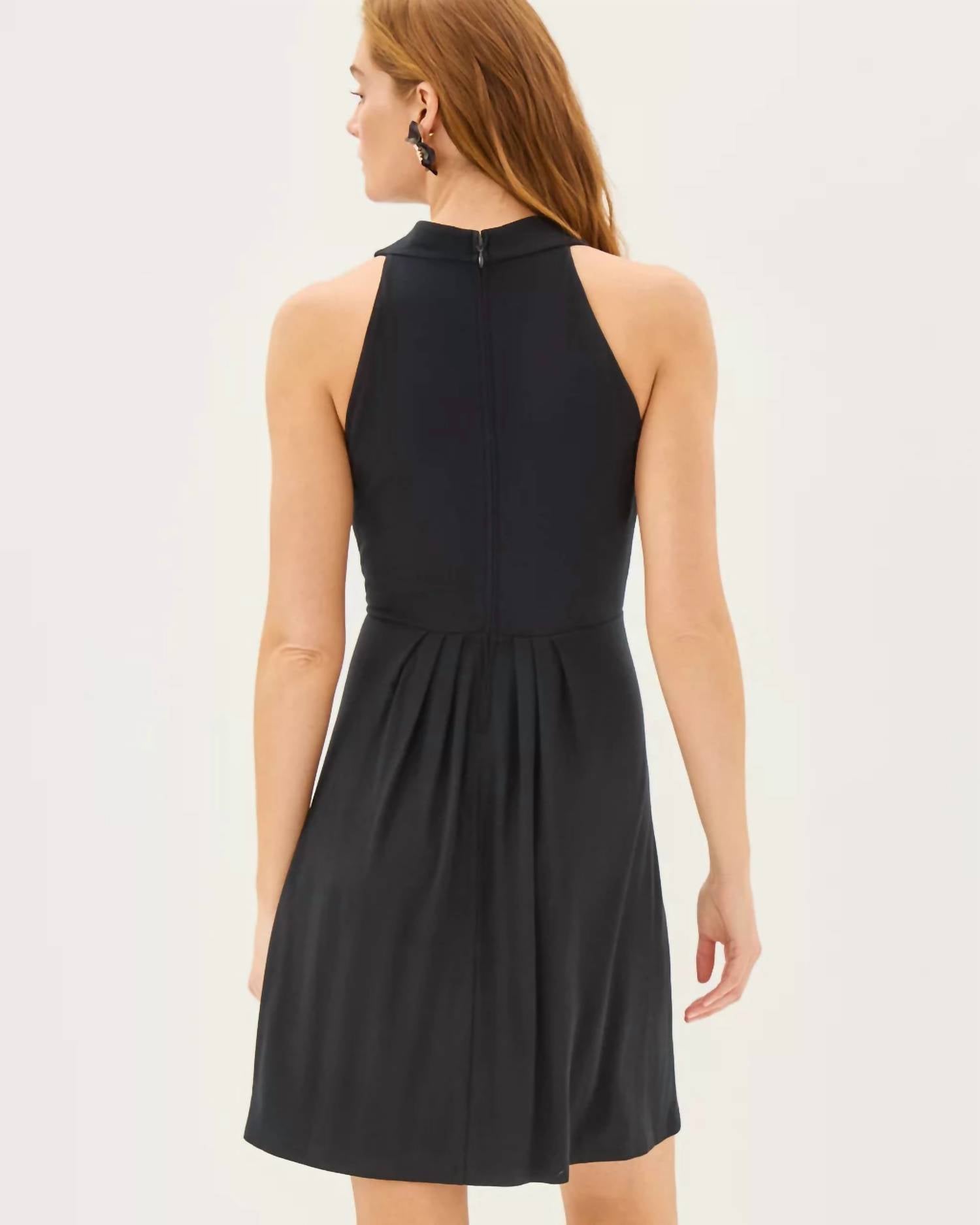 The kind of easy and flattering dress you'll be reaching for all season long. Introducing the Wisteria Dress by Lilly Pulitzer, a sophisticated choice for your next cocktail party. This sleeveless mini dress boasts a fit-and-flare silhouette with a deep v-neckline and cut-in armholes. The functional front tie detail at the waist adds an elegant touch, while the vibrant Noir color enhances its minimalist appeal. Measuring 37" from shoulder to hem, this imported piece features a zip closure for a flattering fit.