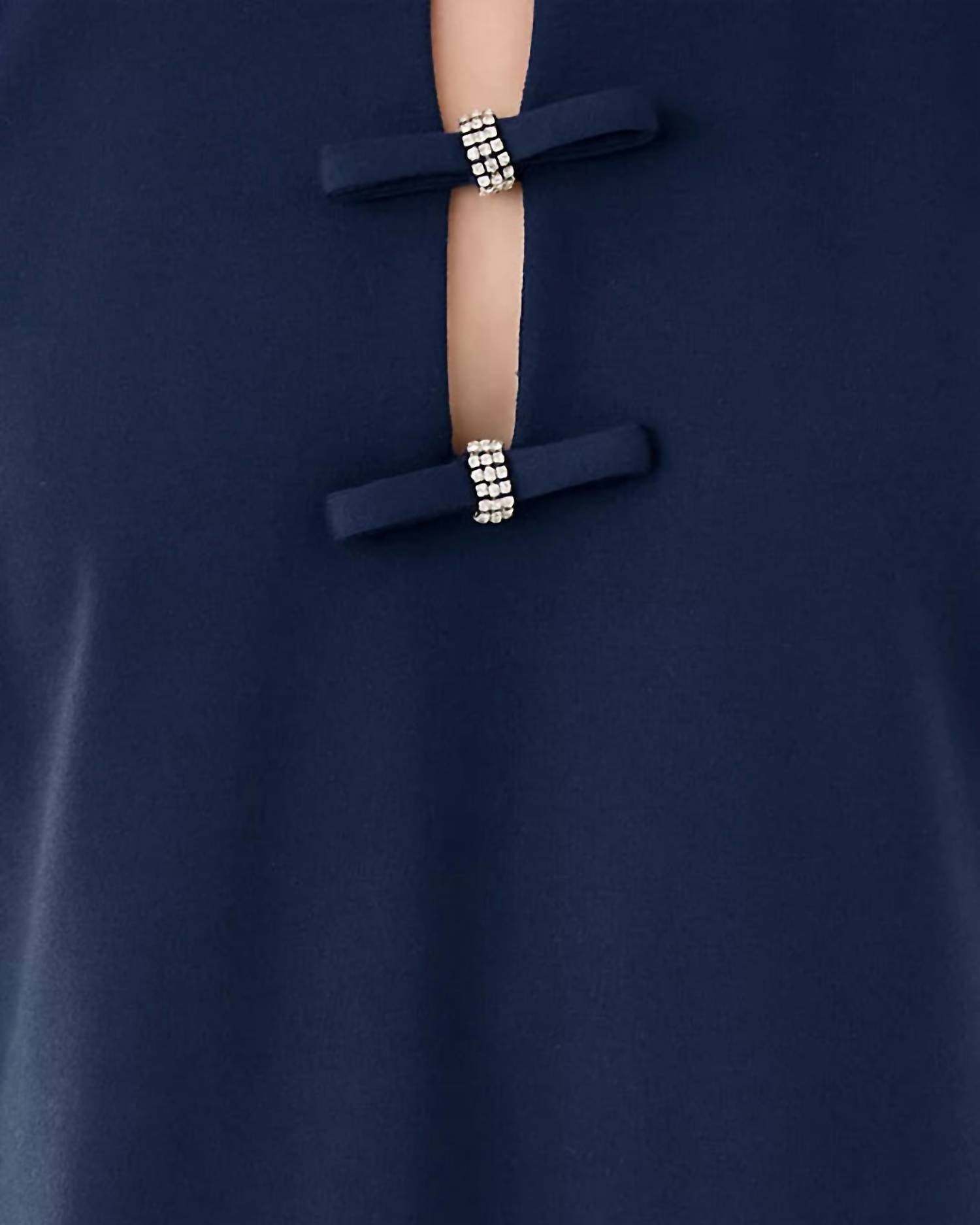 A flattering yet comfortable dress you'll be reaching for season after season. Elevate your cocktail wardrobe with the Women's Leyland Shift Dress by Lilly Pulitzer, a minimalist piece in Low Tide Navy. This sheath dress features three-quarter length sleeves, a crew neckline adorned with rhinestone bows, and offers a straight fit. The garment measures 35 1/2" from shoulder to hem based on a size small/4, fitting snugly at the chest and hip while allowing more room at the waist. Origin: Imported. Closure: Pull-on. Ideal for those seeking a vibrant, statement-making silhouette.
