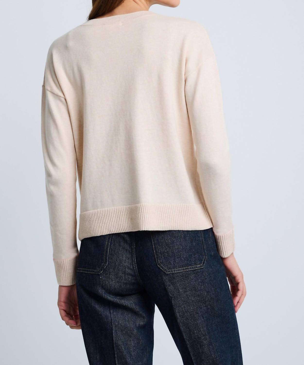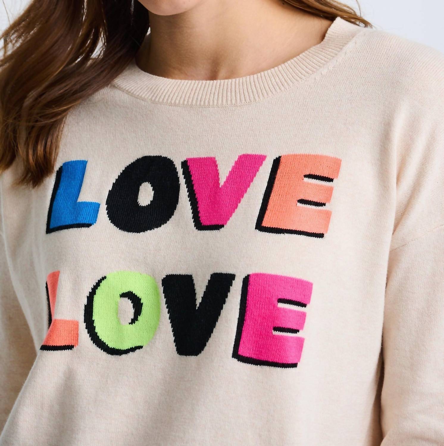 Experience the perfect blend of comfort and style with this trendy crew neck sweater, designed to effortlessly elevate your wardrobe. Pair it with your favorite denim and loafers for the perfect look. Embrace comfort and timeless style with the Love Love Sweater by LISA TODD, designed in a soft and luxurious ivory Cotton-Cashmere blend. This women's long sleeve sweater features a relaxed crewneck and eye-catching contrast intarsia lettering across the chest. Closure is effortlessly chic with a pull-on style, complemented by ribbed finishes at the cuffs and hem for a touch of polish. Perfect for fall vacations or as a Y2K trend staple, this sweater effortlessly combines warmth with fashion-forward detailing.
