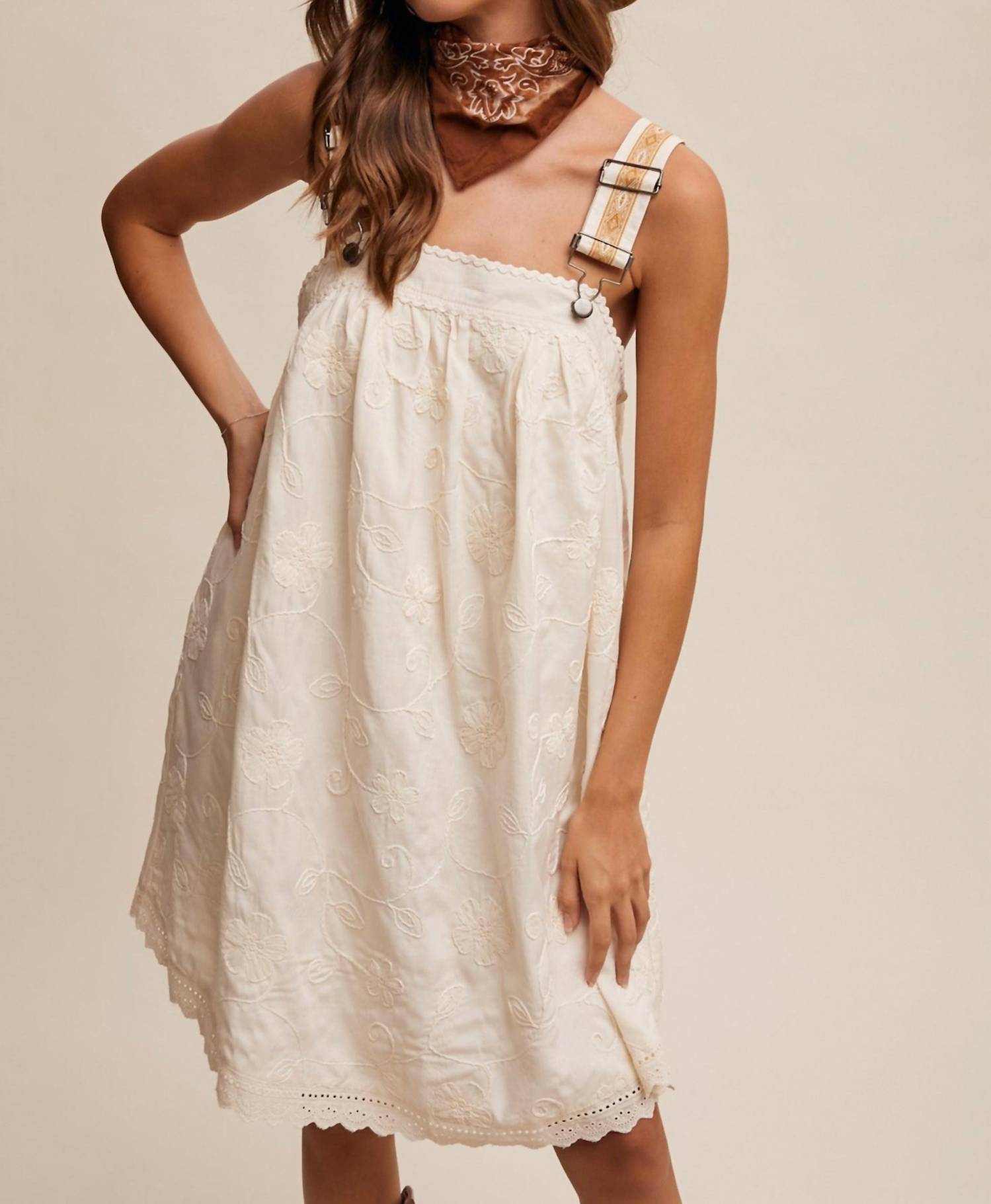 A short and breezy dress for those warmer days. Embrace chic vintage charm with the Arya Embroidered Overall Mini Dress by Listicle, designed in an elegant cream color. This sleeveless sheath silhouette features a textured floral pattern with intricate embroidery and swirl crochet accents for added femininity. Made from a cotton blend, it offers adjustable jacquard tape shoulder straps for a custom fit and convenient hidden side seam pockets. Closure: Pull on. Care: Hand wash. Perfect for summer travel, this versatile mini dress is ideal for garden parties and casual outings.
