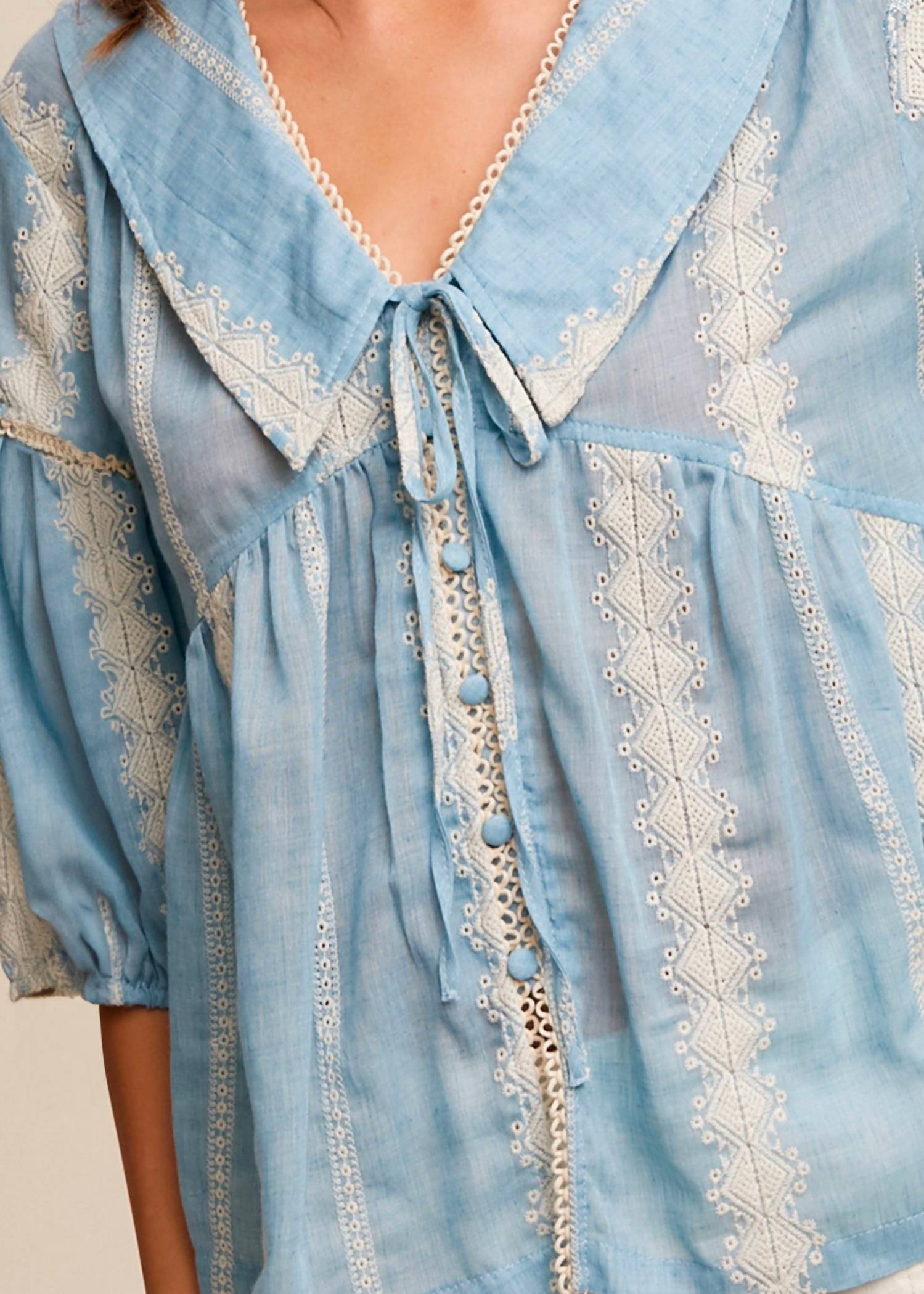Pair this with your favorite jeans and slides for your next girls night out. Introducing the Marleigh Embroidered Baby Doll Top by Listicle, a vintage-inspired piece in charming pale blue. This blouse showcases elbow sleeves and an elegant flat collar with delicate lace trim, crafted from a blend of polyester, cotton, and rayon for lightweight comfort. A button closure and tie-front neckline provide adjustable styling, perfect for any occasion. Care: Hand wash and line dry.