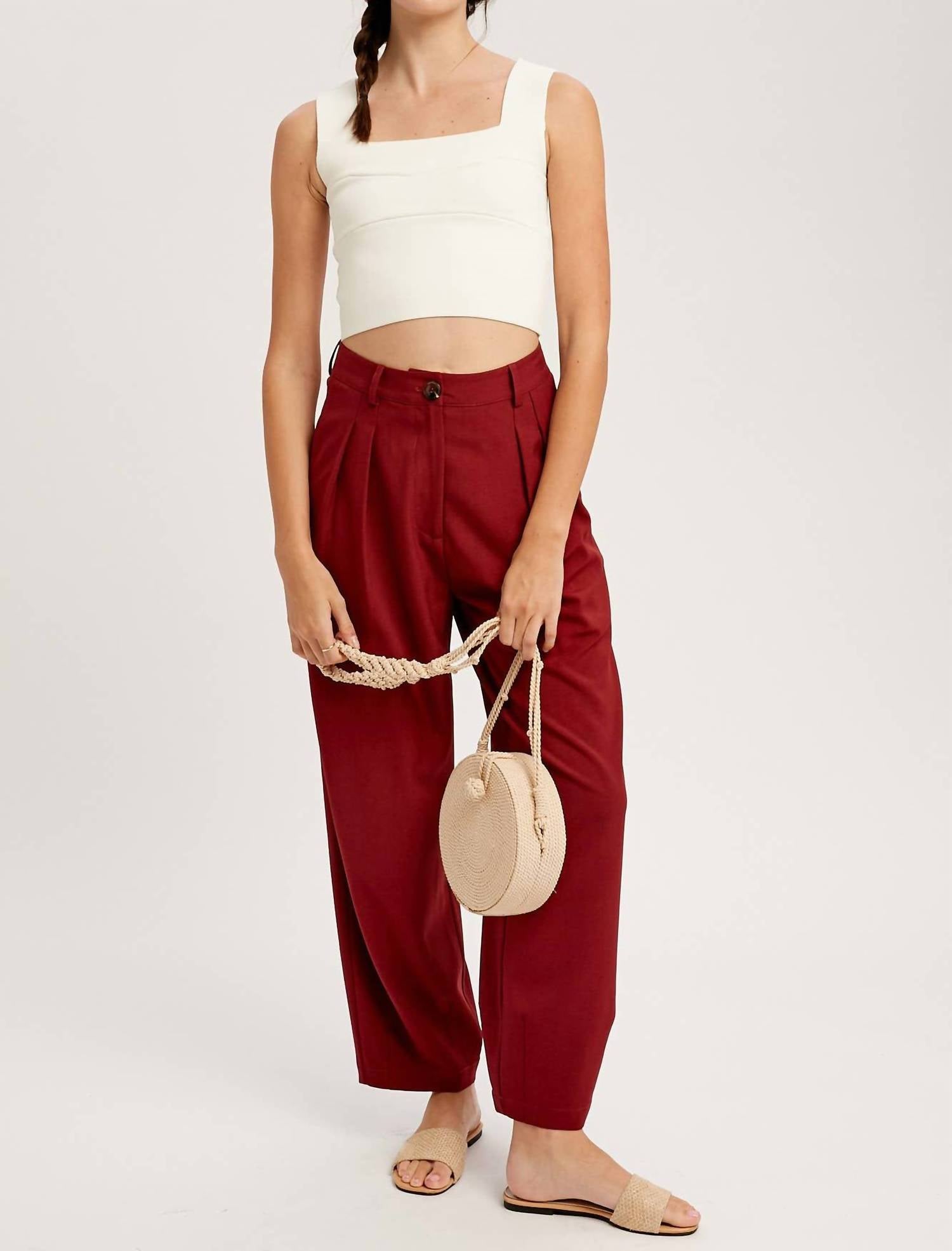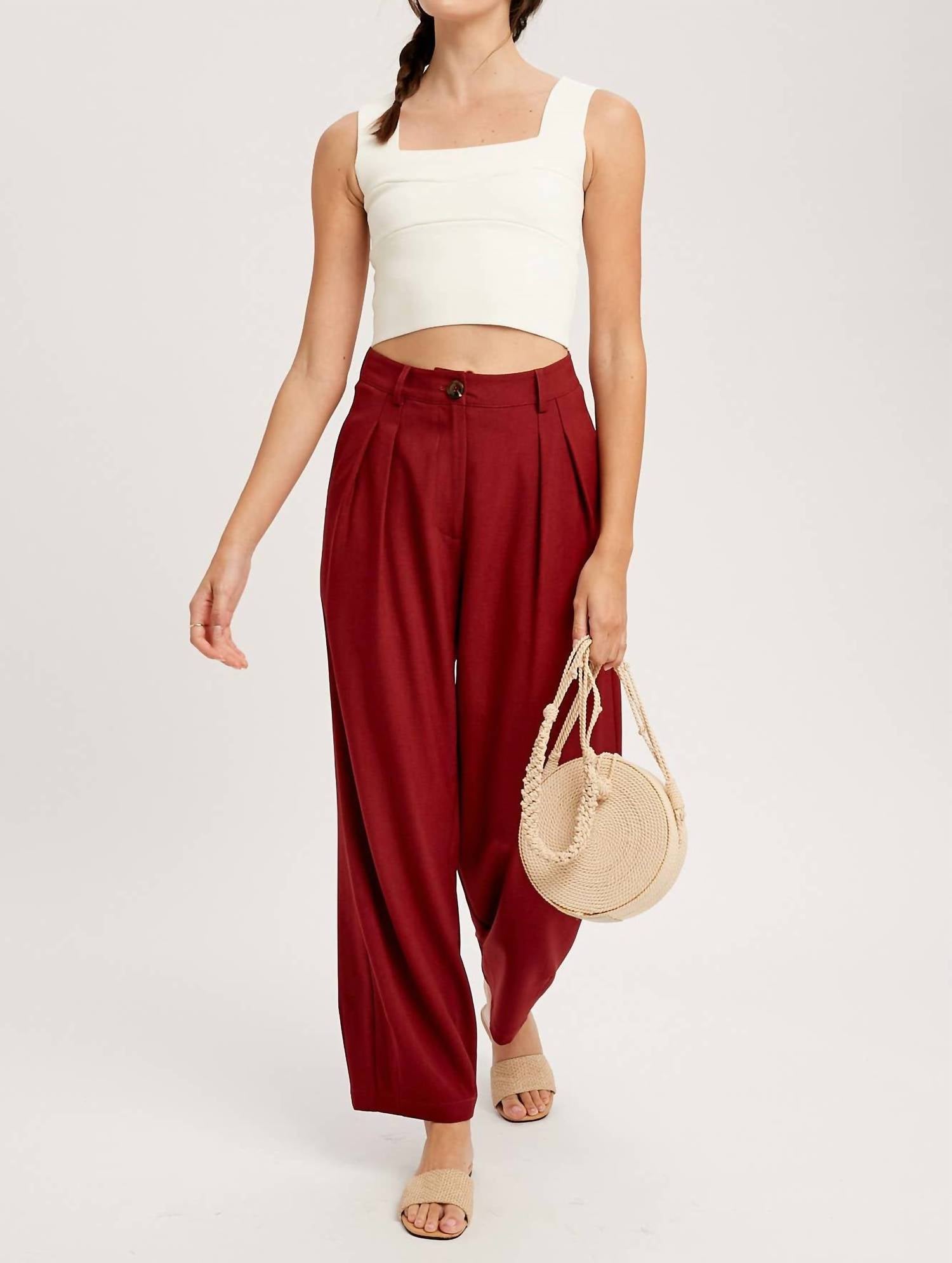 Elevate your style with the Pleated Wide-Leg Trouser by Listicle, a chic addition to your wardrobe in a solid wine color. Featuring a high-waisted fit with pleated front detail, these trousers are crafted with a structured woven blend for a smooth finish. Designed with a relaxed wide-leg silhouette, this piece combines side slit and patch back pockets for practical elegance. Closure is zip-style with button and belt loops, delivering a tailored drape perfect for streetwear-inspired vacations.