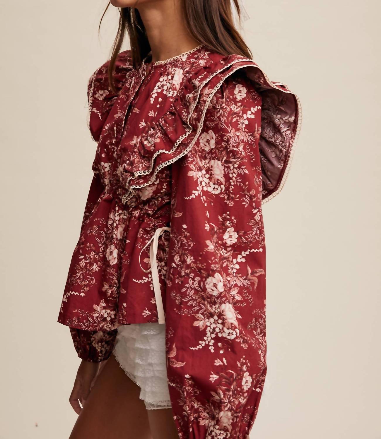 Pair this with your favorite jeans and slides for your next girls night out. Embrace the Victorian charm with the Victorian Floral Ruffle Blouse by Listicle, a poetic blend of nostalgic design and modern elegance. This women's blouse features long puff sleeves and a crewneck, crafted from lightweight woven cotton, ensuring a soft, breathable feel. Adorned with a vintage floral print in cream tones on a striking crimson background, it boasts details like an oversized double ruffle yoke trimmed with ivory crochet lace. Closure wise, it features a delicate button placket, and adjustable side ties offer a customizable fit. Perfect for any holiday party or Valentine's Day celebration.
