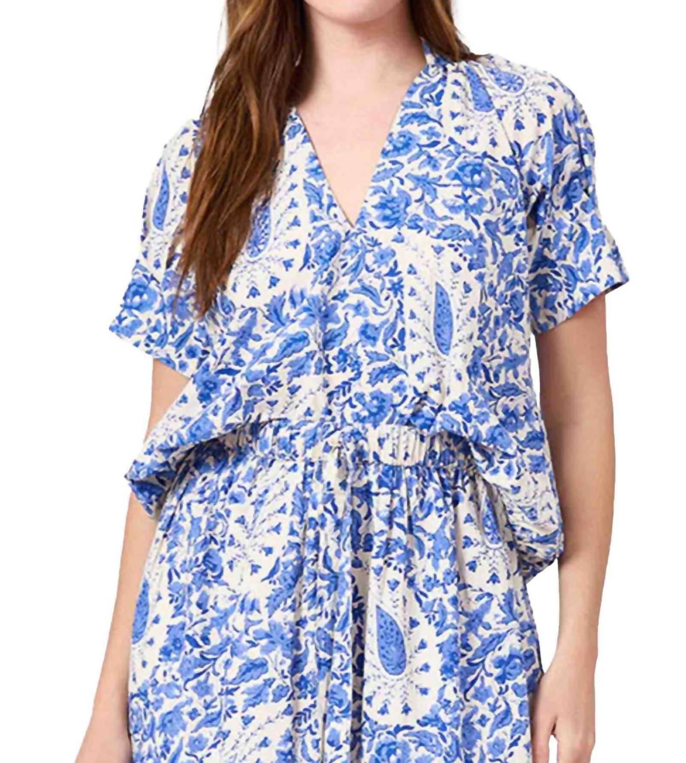 A versatile blouse that works from desk to dinner! The Livro Merritt top brings effortless polish to your wardrobe with its stunning steel paisley motif. This beautifully tailored blouse features a classic collar and relaxed short sleeves that create the perfect balance of professional and casual chic. The intricate blue florals against cream fabric tell a story of timeless elegance. Tuck it into high-waisted trousers for the office, knot it at the waist over a slip dress for brunch, or pair with denim for weekend errands. The versatile silhouette flatters every figure while the premium fabric drapes beautifully without being too structured. Layer under blazers or cardigans when the Texas air conditioning gets chilly.