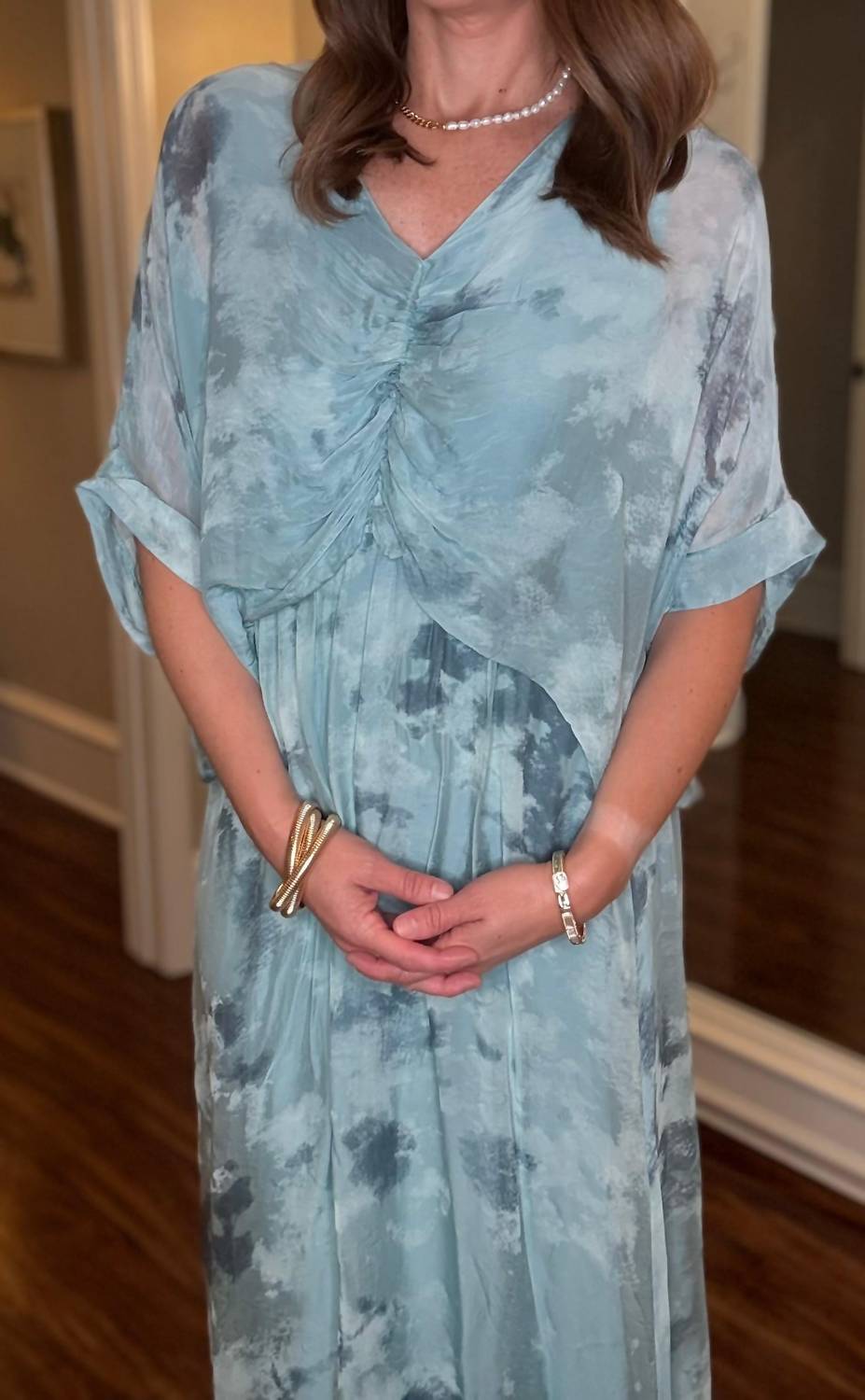 Style this maxi with your favorite statement necklace and sandals for the perfect look. Introducing the Tie Dye Silk Dress by Look Mode USA, a stunning maxi dress exuding Boho Chic vibes. This light blue patterned piece features short sleeves and a V-neck, with a unique pinched fabric design in the front and a blousy sheer top draping over the waist. Crafted from a luxurious blend of 70% viscose and 30% silk, the dress is lined with a comfortable 96% viscose and 4% elastane for a soft feel. Closure: Pull on. Perfect for a holiday party or Hanukkah celebration.
