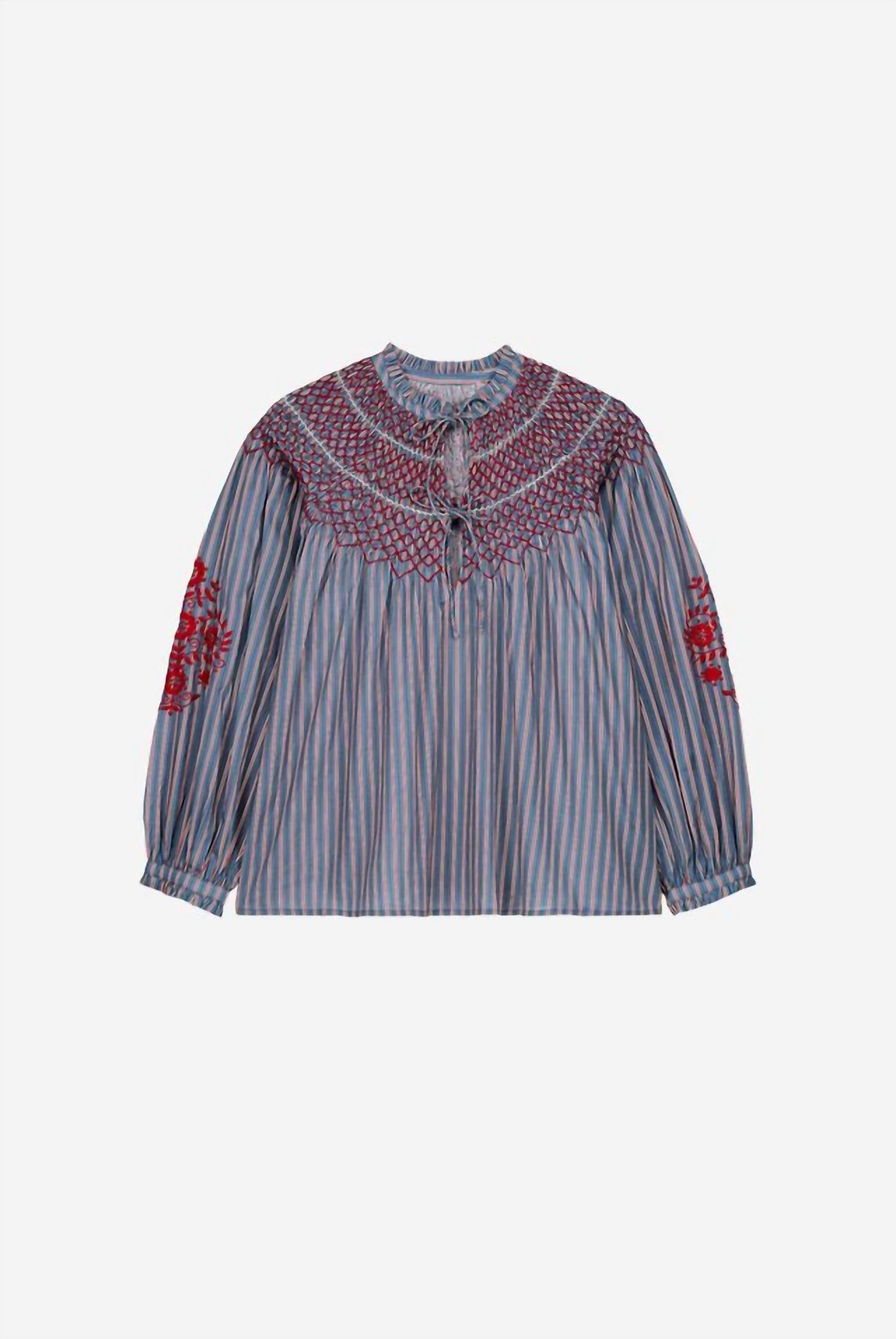 A versatile blouse that works from desk to dinner! Discover the Striped Cotton Voile Blouse by Louise Misha, an embodiment of intricate craftsmanship and style. This women's piece features long puffed sleeves with detailed embroidery, a distinctive round collar with ruffled trim, and a charming tie closure. Made from 100% cotton, this patterned blue blouse offers a unique blend of comfort and elegance. For optimal care, please dry clean only.