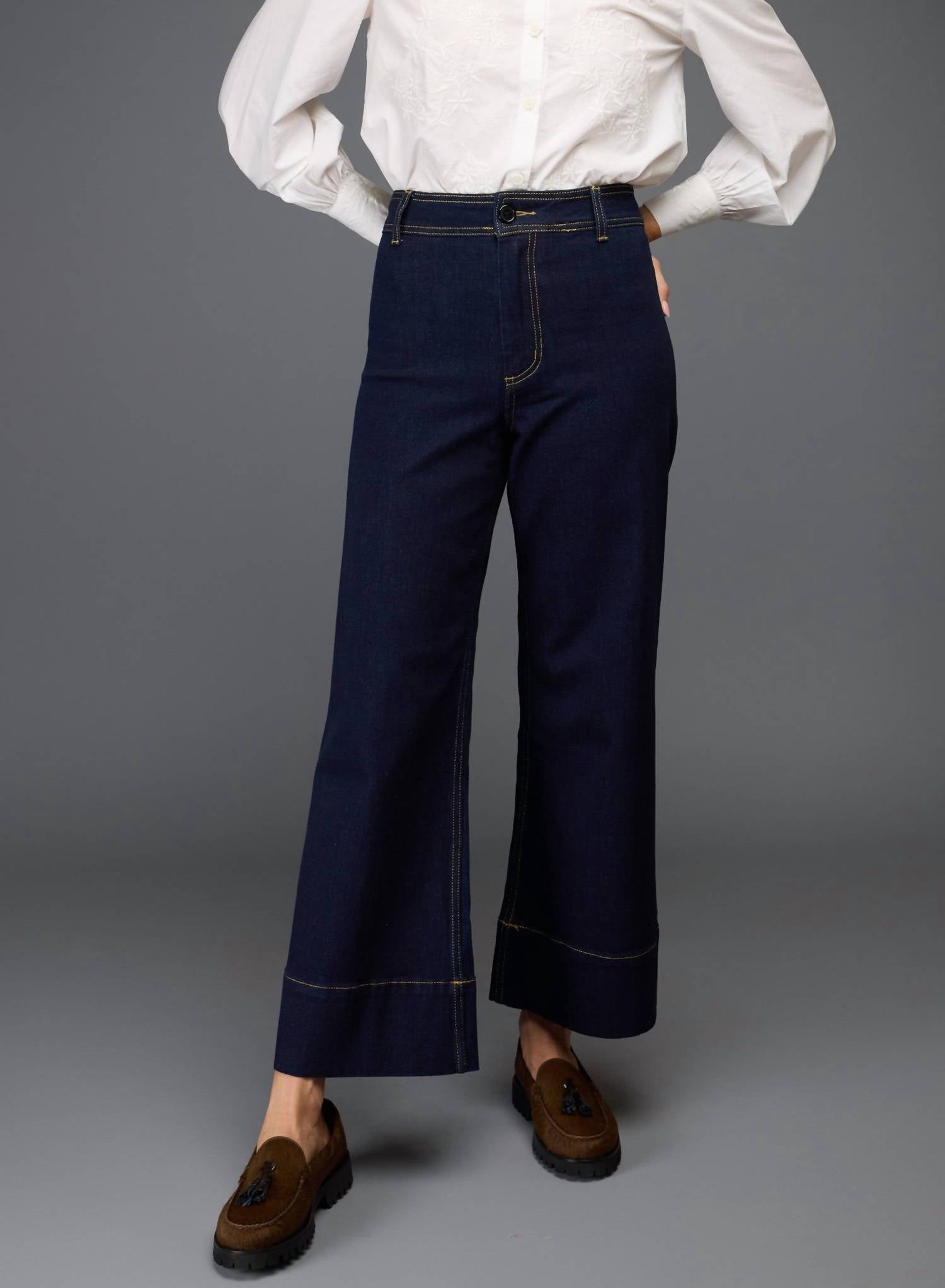 Just as cute as they are comfortable. Introducing the Costa Jeans by Love Binetti, a stylish addition to your wardrobe with a relaxed fit. These navy and gold high-waist denim jeans are made from 100% cotton, featuring a classic wide-leg style. Closure: Zip closure. Care: Hand wash recommended, perfect for embracing the '90s fashion trend this spring on your vacation.