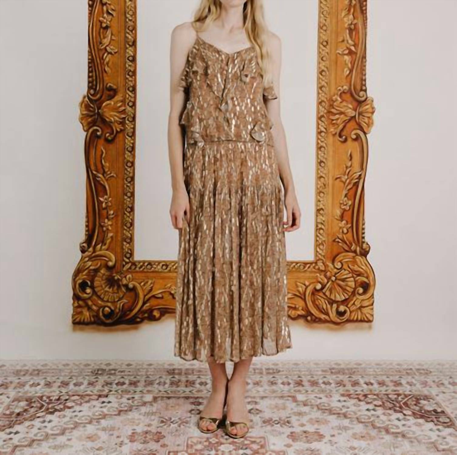 Throw this on with your favorite blazer for a more polished look. Introducing the Lilly Cami Top by LOVE THE LABEL, an elegant party piece in Cavalier Python Print with a boho chic vibe. This women's camisole features dainty spaghetti straps and a v-neck adorned with delicate ruffles, perfect for Thanksgiving or any holiday gathering. Crafted from cotton, the top boasts a unique blend of animal print with touches of gold lurex for a touch of shimmer. Easy to wear with a pull-on closure, it's conveniently machine washable and should be line dried.