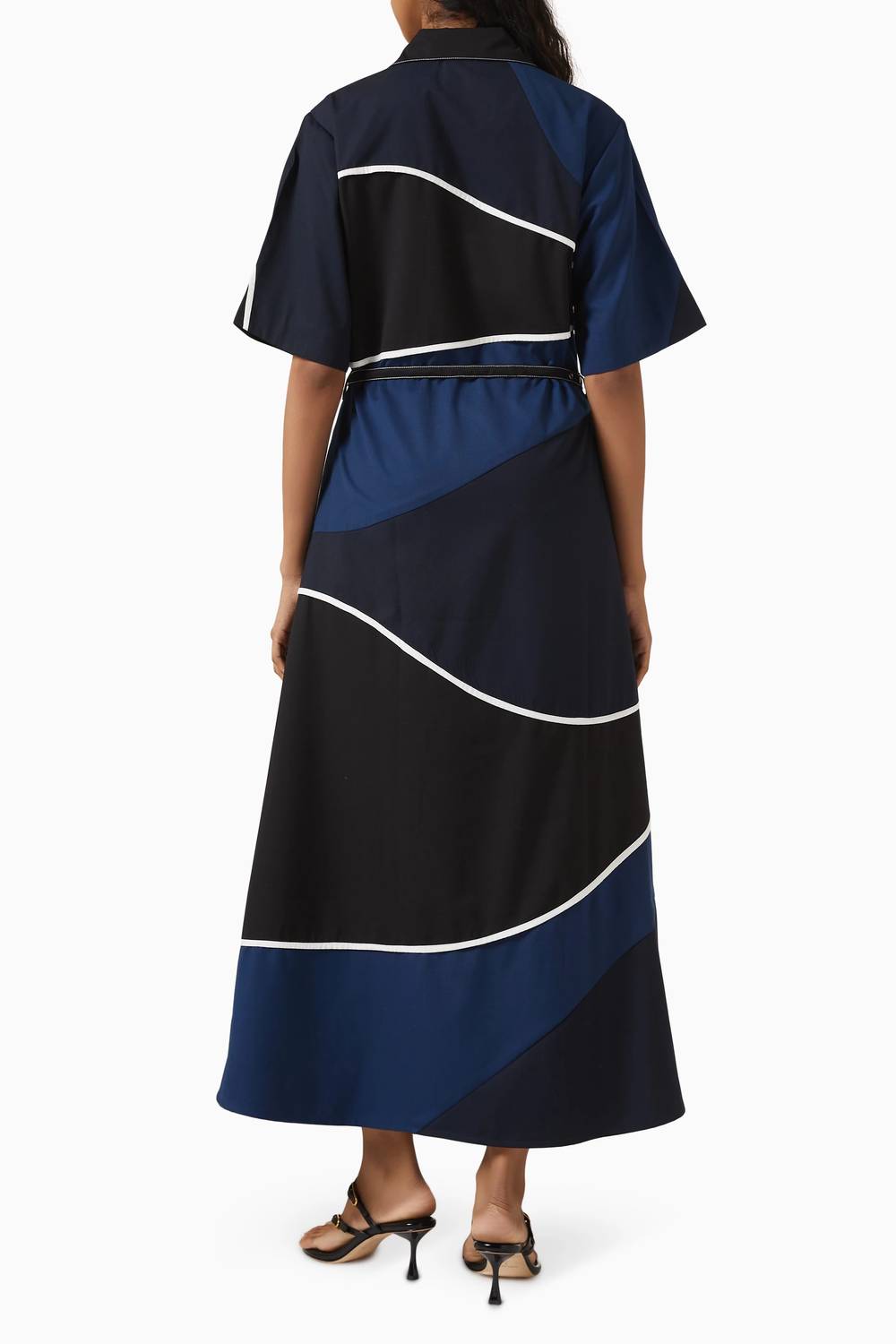 Who doesn't love a good maxi dress? This one you'll be reaching for season after season. Presenting the "Carol" Dress by LOVEBIRDS, a maxi shirtdress that embodies elegance and sophistication through its onyx, midnight blue, and navy colorblock design. Elbow sleeves complement the spread collar and A-line silhouette, with a convenient button front closure. Expertly crafted from rayon and cellulose acetate, this dress measures approximately 52 inches from shoulders to hem, ensuring it falls gracefully below the knee. Imported and easy to wear with its slipover style, this dress requires dry cleaning to maintain its pristine condition.