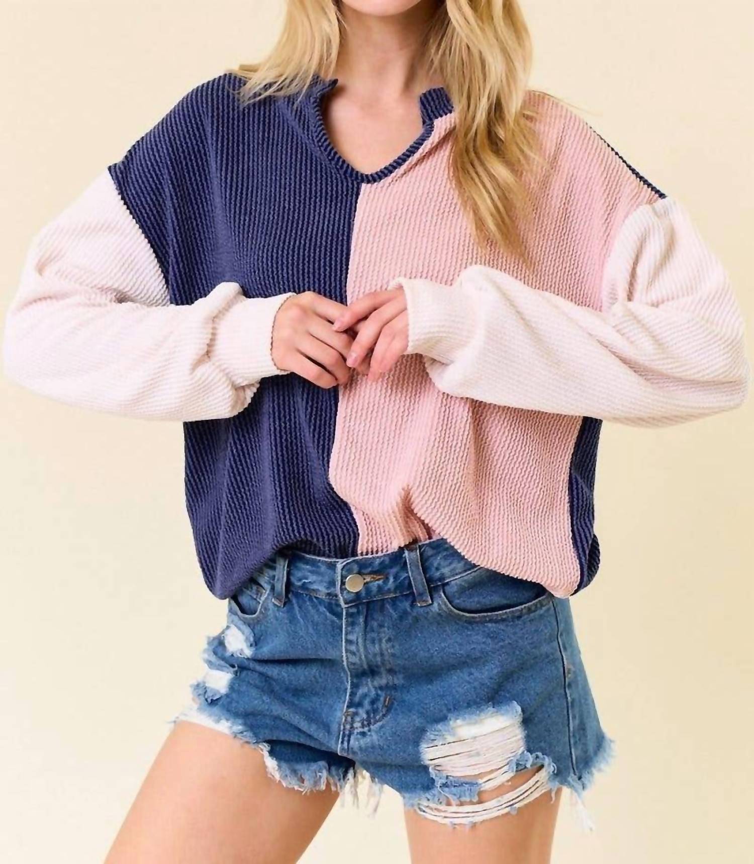 You'll be reaching for this comfy and classic v-neck sweater all season long. Presenting the My Other Half Top by Lovely Melody, a captivating addition to your wardrobe in navy, pale peach, and oat. This long-sleeve piece boasts a chic V-neckline with a subtle front V-detail and a striking color-block design. Made from high-quality cotton, it ensures a flattering, comfortable fit. Closure: Pull on. Care: Machine wash, lay flat to dry.