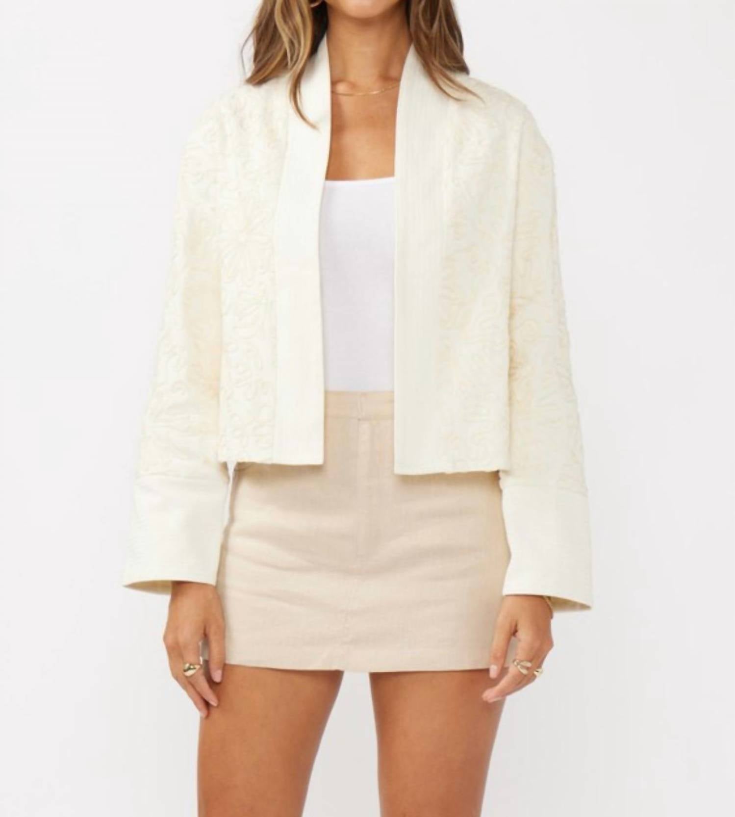 A casual yet cool jacket that every closset needs. Elevate your summer wardrobe with the ANNICSE Floral Canvas Jacket by LOVESTITCH, an exquisite piece in a vanilla hue. This long-sleeve jacket features intricate detailing across the front, back, and sleeves, matched with a contrast collar for an added touch of sophistication. Crafted from 100% polyester, it includes side pockets and a cotton voile interior, and is secured with a hook and eye closure. Care instructions recommend hand washing and line drying to maintain its elegance.