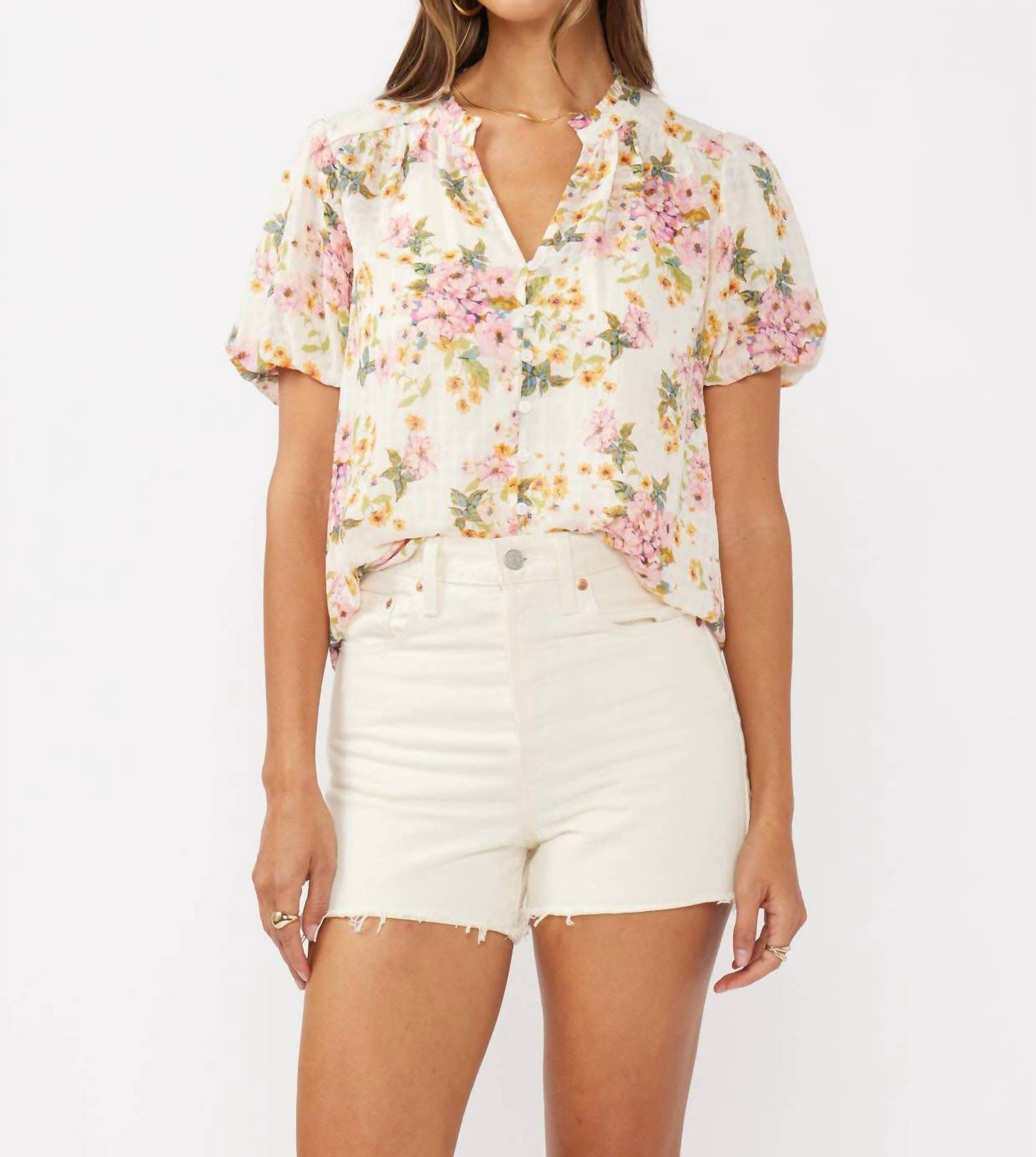 Pair this with your favorite jeans and slides for your next girls night out. Introducing the LOVESTITCH Floral Puff Sleeve Button-Down Top in Natural Dusty Pink, a delightful addition to your spring wardrobe with a boho chic flair. This blouse features short puff sleeves and a flattering V-neckline, crafted from 100% polyester for a breathable, comfortable wear. Made in China, it boasts a timeless button closure that elegantly complements its feminine floral pattern. Perfect for both casual days and holiday parties, this versatile piece effortlessly adds a touch of elegance to any ensemble.